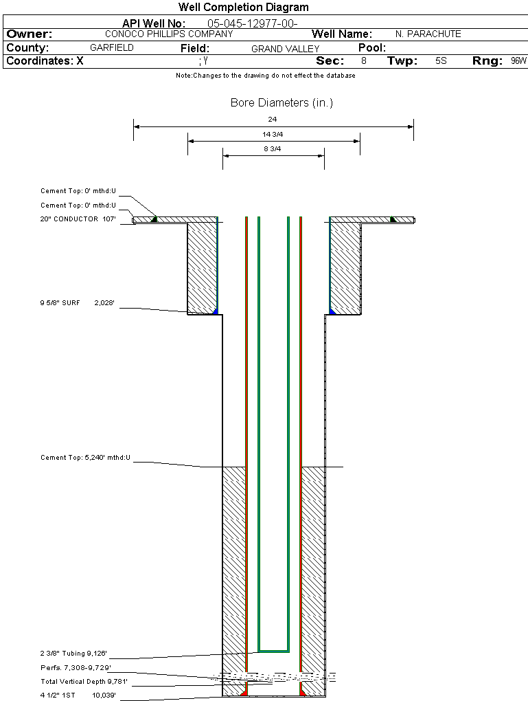 | Wellbore Completed | | Completion Date: | 5/13/2007 | | Spud Date: | 4/16/2007 | Spud Date Is: | ACTUAL | | Measured TD: | 10055 ft. | Measured PB depth: | | | True Vertical TD: | 9781 ft. | True Vertical PB depth: | | | Top PZ Location: | Sec:8 Twp: 5S 96W | Footage: 974 FNL 1587 FEL | | Bottom Hole Location: | Sec:8 Twp: 5S 96W | Footage: 974 FNL 1587 FEL | | Log Types: | CBL/VDL/MI/GR/CCL/TEMP;RST QL AD; TEMP;RSL/ISM/GR/CCL | | Casing: | String Type: CONDUCTOR, Hole Size: 24 in., Size: 20 in., Top: 0 ft., Depth: 107 ft., Weight: , Citings Type: ACTUAL | | Cement: | Sacks: , Top: 0 ft., Bottom: 107 ft., Determination Method: | | Casing: | String Type: SURF, Hole Size: 14.75 in., Size: 9.625 in., Top: 0 ft., Depth: 2028 ft., Weight: , Citings Type: ACTUAL | | Cement: | Sacks: 1400, Top: 0 ft., Bottom: 2028 ft., Determination Method: | | Casing: | String Type: 1ST, Hole Size: 8.75 in., Size: 4.5 in., Top: 0 ft., Depth: 10039 ft., Weight: , Citings Type: ACTUAL | | Cement: | Sacks: 890, Top: 5240 ft., Bottom: 10039 ft., Determination Method: CBL | | Formation | Interval Top | Log Bottom | Cored | DSTs | | WASATCH | 2455 ft. | | N | N | | WASATCH G | 4863 ft. | | N | N | | OHIO CREEK | 6118 ft. | | N | N | | WILLIAMS FORK | 6571 ft. | | N | N | | CAMEO | 9364 ft. | | N | N | | ROLLINS | 9934 ft. | | N | N |