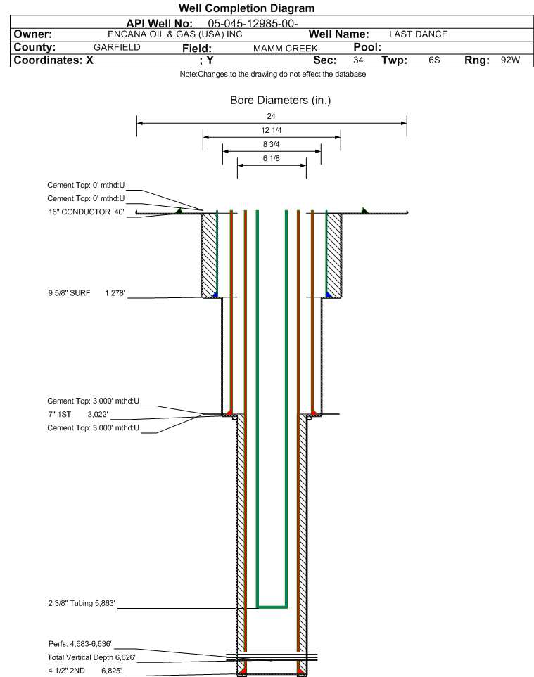 | Wellbore Completed | | Completion Date: | 1/22/2008 | | Spud Date: | 1/8/2008 | Spud Date Is: | ACTUAL | | Measured TD: | 6870 ft. | Measured PB depth: | 6779 ft. | | True Vertical TD: | 6626 ft. | True Vertical PB depth: | 6535 ft. | | Top PZ Location: | Sec:34 Twp: 6S 92W | Footage: 1697 FSL 1994 FEL | | Bottom Hole Location: | Sec:34 Twp: 6S 92W | Footage: 1697 FSL 1994 FEL | | Log Types: | RST, CBL | | Casing: | String Type: CONDUCTOR, Hole Size: 24 in., Size: 16 in., Top: 0 ft., Depth: 40 ft., Weight: 42 , Citings Type: ACTUAL | | Cement: | Sacks: , Top: 0 ft., Bottom: 40 ft., Determination Method: CALC | | Casing: | String Type: SURF, Hole Size: 12.25 in., Size: 9.625 in., Top: 0 ft., Depth: 1278 ft., Weight: 36 , Citings Type: ACTUAL | | Cement: | Sacks: 590, Top: 0 ft., Bottom: 1278 ft., Determination Method: CALC | | Casing: | String Type: 1ST, Hole Size: 8.75 in., Size: 7 in., Top: 0 ft., Depth: 3022 ft., Weight: 23 , Citings Type: ACTUAL | | Cement: | Sacks: 90, Top: 3000 ft., Bottom: 3078 ft., Determination Method: CBL | | Casing: | String Type: 2ND, Hole Size: 6.125 in., Size: 4.5 in., Top: 0 ft., Depth: 6825 ft., Weight: 11.6 , Citings Type: ACTUAL | | Cement: | Sacks: 332, Top: 3000 ft., Bottom: 6870 ft., Determination Method: CBL | | Formation | Interval Top | Log Bottom | Cored | DSTs | | WASATCH | 0 ft. | 3613 ft. | N | N | | WILLIAMS FORK | 3614 ft. | 6755 ft. | N | N | | ROLLINS | 6756 ft. | | N | N |