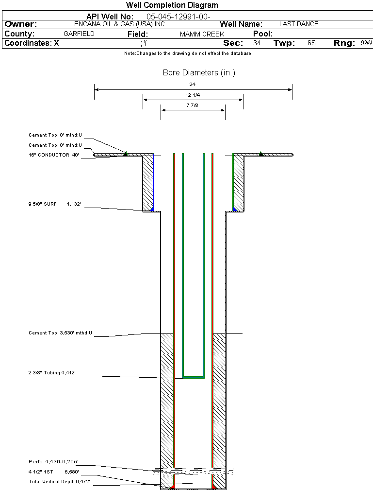 | Wellbore Completed | | Completion Date: | 7/4/2007 | | Spud Date: | 6/23/2007 | Spud Date Is: | ACTUAL | | Measured TD: | 6585 ft. | Measured PB depth: | 6530 ft. | | True Vertical TD: | 6472 ft. | True Vertical PB depth: | | | Top PZ Location: | Sec:34 Twp: 6S 92W | Footage: 394 FSL 1787 FEL | | Bottom Hole Location: | Sec:34 Twp: 6S 92W | Footage: 394 FSL 1787 FEL | | Log Types: | CBL/GR/TEMP, RST/GR | | Casing: | String Type: CONDUCTOR, Hole Size: 24 in., Size: 16 in., Top: 0 ft., Depth: 40 ft., Weight: , Citings Type: ACTUAL | | Cement: | Sacks: , Top: , Bottom: 40 ft., Determination Method: CALC | | Casing: | String Type: SURF, Hole Size: 12.25 in., Size: 9.625 in., Top: 0 ft., Depth: 1132 ft., Weight: , Citings Type: ACTUAL | | Cement: | Sacks: 570, Top: 0 ft., Bottom: 1132 ft., Determination Method: CALC | | Casing: | String Type: 1ST, Hole Size: 7.875 in., Size: 4.5 in., Top: 0 ft., Depth: 6580 ft., Weight: , Citings Type: ACTUAL | | Cement: | Sacks: 865, Top: 3530 ft., Bottom: 6580 ft., Determination Method: CBL | | Formation | Interval Top | Log Bottom | Cored | DSTs | | WASATCH | 0 ft. | 3384 ft. | N | N | | WILLIAMS FORK | 3385 ft. | 6492 ft. | N | N | | ROLLINS | 6493 ft. | 6585 ft. | N | N |
