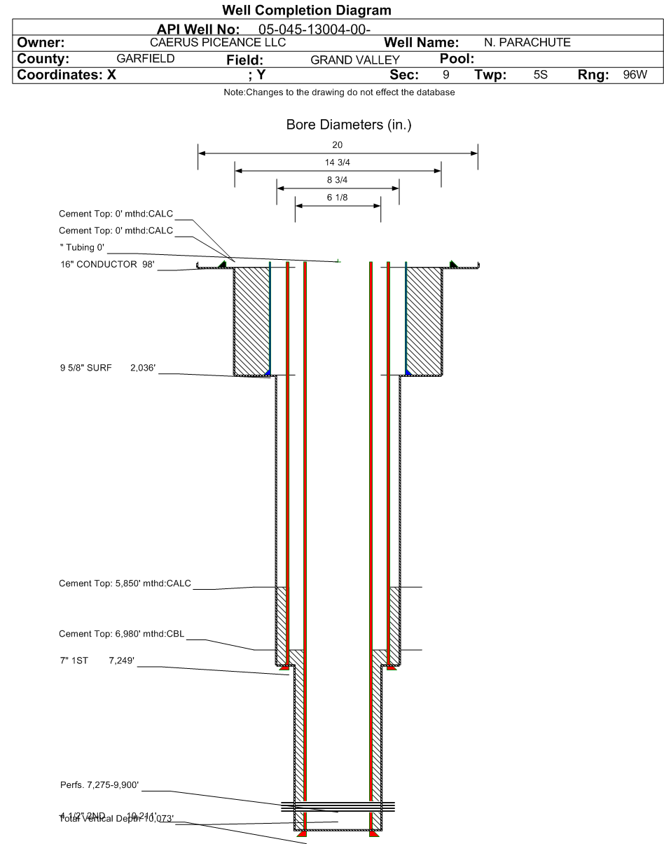| Wellbore Completed | | Completion Date: | 8/12/2007 | | Spud Date: | 7/24/2007 | Spud Date Is: | ACTUAL | | Measured TD: | 10220 ft. | Measured PB depth: | 10165 ft. | | True Vertical TD: | 10073 ft. | True Vertical PB depth: | 10017 ft. | | Top PZ Location: | Sec:9 Twp: 5S 96W | Footage: 1000 FNL 1596 FEL | | Bottom Hole Location: | Sec:9 Twp: 5S 96W | Footage: 1000 FNL 1596 FEL | | Log Types: | HDIL/CZ DL/CNL/GR/CL; HDIL/CZDL/CNL/GRL/CL; RPM/GRL/CCL; RPM/GSA; TEMP/GRL; MRL/GL/CL; ML/GRL/CL; BPL;TEMP; SEGMENT-BL/GR;MUD | | Casing: | String Type: CONDUCTOR, Hole Size: , Size: , Top: 0 ft., Depth: 98 ft., Weight: 94# , Citings Type: ACTUAL | | Cement: | Sacks: 450, Top: 0 ft., Bottom: 98 ft., Determination Method: CALC | | Casing: | String Type: SURF, Hole Size: 14.75 in., Size: 9.625 in., Top: 0 ft., Depth: 2036 ft., Weight: 36# , Citings Type: ACTUAL | | Cement: | Sacks: 1387, Top: 0 ft., Bottom: 2036 ft., Determination Method: VISU | | Casing: | String Type: 1ST, Hole Size: 8.75 in., Size: , Top: 0 ft., Depth: 7249 ft., Weight: 23# , Citings Type: ACTUAL | | Cement: | Sacks: 140, Top: 5850 ft., Bottom: 7255 ft., Determination Method: CALC | | Casing: | String Type: 2ND, Hole Size: 6.125 in., Size: 4.5 in., Top: 0 ft., Depth: 10210 ft., Weight: 11.6# , Citings Type: ACTUAL | | Cement: | Sacks: 160, Top: 6980 ft., Bottom: 10210 ft., Determination Method: CBL | | Formation | Interval Top | Log Bottom | Cored | DSTs | | WASATCH | 2312 ft. | | N | N | | WASATCH G | 4907 ft. | | N | N | | OHIO CREEK | 6147 ft. | | N | N | | WILLIAMS FORK | 6594 ft. | | N | N | | CAMEO | 9558 ft. | | N | N | | ROLLINS | 10119 ft. | | N | N |