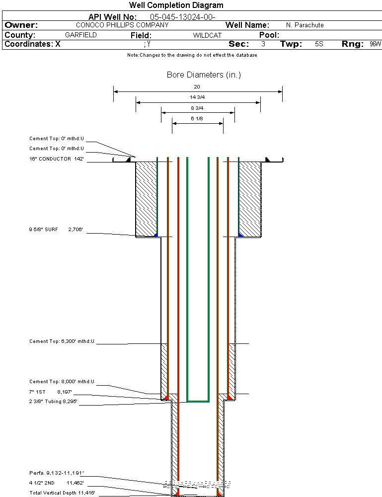 | Wellbore Completed | | Completion Date: | 8/5/2007 | | Spud Date: | 7/8/2007 | Spud Date Is: | ACTUAL | | Measured TD: | 11508 ft. | Measured PB depth: | 11462 ft. | | True Vertical TD: | 11416 ft. | True Vertical PB depth: | 11370 ft. | | Top PZ Location: | Sec:3 Twp: 5S 96W | Footage: 2304 FNL 361 FEL | | Bottom Hole Location: | Sec:3 Twp: 5S 96W | Footage: 2304 FNL 361 FEL | | Log Types: | DSN/SD/HRI; DPN/SD; HRI/RCBL; BVP; BV; MUDLOG | | Casing: | String Type: CONDUCTOR, Hole Size: 20 in., Size: 16 in., Top: 0 ft., Depth: 142 ft., Weight: , Citings Type: ACTUAL | | Cement: | Sacks: , Top: 0 ft., Bottom: 142 ft., Determination Method: CALC | | Casing: | String Type: SURF, Hole Size: 14.75 in., Size: 9.625 in., Top: 0 ft., Depth: 2706 ft., Weight: 36 , Citings Type: ACTUAL | | Cement: | Sacks: 1925, Top: 0 ft., Bottom: 2706 ft., Determination Method: CALC | | Casing: | String Type: 1ST, Hole Size: 8.75 in., Size: 7 in., Top: 0 ft., Depth: 8197 ft., Weight: 23 , Citings Type: ACTUAL | | Cement: | Sacks: 180, Top: 6300 ft., Bottom: 8197 ft., Determination Method: CALC | | Casing: | String Type: 2ND, Hole Size: 6.125 in., Size: 4.5 in., Top: 0 ft., Depth: 11462 ft., Weight: 11.6 , Citings Type: ACTUAL | | Cement: | Sacks: 220, Top: 8000 ft., Bottom: 11462 ft., Determination Method: CBL | | Formation | Interval Top | Log Bottom | Cored | DSTs | | WASATCH | 3698 ft. | | N | N | | OHIO CREEK | 7250 ft. | | N | N | | WILLIAMS FORK | 7700 ft. | | N | N | | CAMEO | 10806 ft. | | N | N | | ROLLINS | 11405 ft. | | N | N |