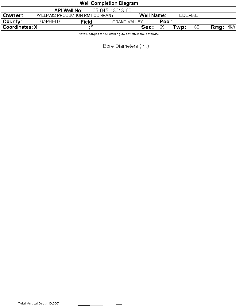 Wellbore #00 Wellbore Classification: Status: AL - 7/14/2011 Measured TD: | Wellbore Data for Original Wellbore | Wellbore Classification: AL - 7/14/2011 | | Wellbore Permit | DIRECTIONAL | | Permit #: | 20064922 | Expiration Date: | 11/12/2007 | | Proposed Top PZ Location: | Sec: Twp: | Footage: 923 FSL 752 FWL | | Bottom Hole Location: | Sec:25 Twp: 6S 96W | Footage: 923 FSL 752 FWL | | Proposed Depth/Form: | 7596 ft. | | Surface Mineral Owner Same: | Yes | | Mineral Owner: | FEDERAL | Surface Owner: | FEDERAL | | Unit: | | Unit Number: | | | Formation And Spacing: | Code: WMFK , Formation: WILLIAMS FORK , Order: 139-40 , Unit Acreage: 320, Drill Unit: S2 | | Casing: | String Type: SURF, Hole Size: 13.5 in., Size: 9.625 in., Top: , Depth: 1102 ft., Weight: 32.3 , Citings Type: PLANNED | | Cement: | Sacks: , Top: 0 ft., Bottom: 1102 ft. | | Casing: | String Type: 1ST, Hole Size: 7.875 in., Size: 4.5 in., Top: , Depth: 7596 ft., Weight: 11.6 , Citings Type: PLANNED | | Cement: | Sacks: , Top: , Bottom: |
