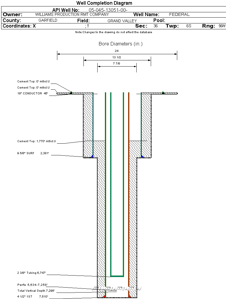 Wellbore #00 Wellbore Classification: GW Status: PR - 7/26/2007 Measured TD: 7522 ft. Vertical TD: 7298 ft.| Wellbore Data for Original Wellbore | Wellbore Classification: GW PR - 7/26/2007 | | Wellbore Permit | DIRECTIONAL | | Permit #: | 20074330 | Expiration Date: | 9/27/2008 | | Proposed Top PZ Location: | Sec: Twp: | Footage: 130 FSL 2205 FWL | | Bottom Hole Location: | Sec:25 Twp: 6S 96W | Footage: 130 FSL 2205 FWL | | Proposed Depth/Form: | 7600 ft. | | Surface Mineral Owner Same: | Yes | | Mineral Owner: | FEDERAL | Surface Owner: | FEDERAL | | Unit: | | Unit Number: | | | Formation And Spacing: | Code: WMFK , Formation: WILLIAMS FORK , Order: 510-9 , Unit Acreage: 320, Drill Unit: S/2 |