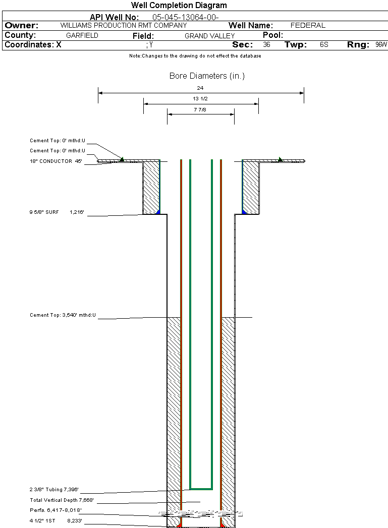 | | Perforation Data: | | Interval Top: | 6417 ft. | # Of Holes: | 95 | | Interval Bottom: | 8018 ft. | Hole Size: | 0.35 in. |