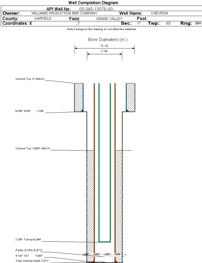 Wellbore #00 Wellbore Classification: GW Status: PR - 6/26/2007 Measured TD: 7106 ft. Vertical TD: 7071 ft.| Wellbore Data for Original Wellbore | Wellbore Classification: GW PR - 6/26/2007 | | Wellbore Permit | DIRECTIONAL | | Permit #: | 20064898 | Expiration Date: | 11/12/2007 | | Proposed Top PZ Location: | Sec: Twp: | Footage: 2336 FSL 1786 FEL | | Bottom Hole Location: | Sec:17 Twp: 6S 96W | Footage: 2336 FSL 1786 FEL | | Proposed Depth/Form: | 7106 ft. | | Surface Mineral Owner Same: | Yes | | Mineral Owner: | FEE | Surface Owner: | FEE | | Unit: | | Unit Number: | | | Formation And Spacing: | Code: WMFK , Formation: WILLIAMS FORK , Order: 510-9 , Unit Acreage: 160, Drill Unit: NW/4 |