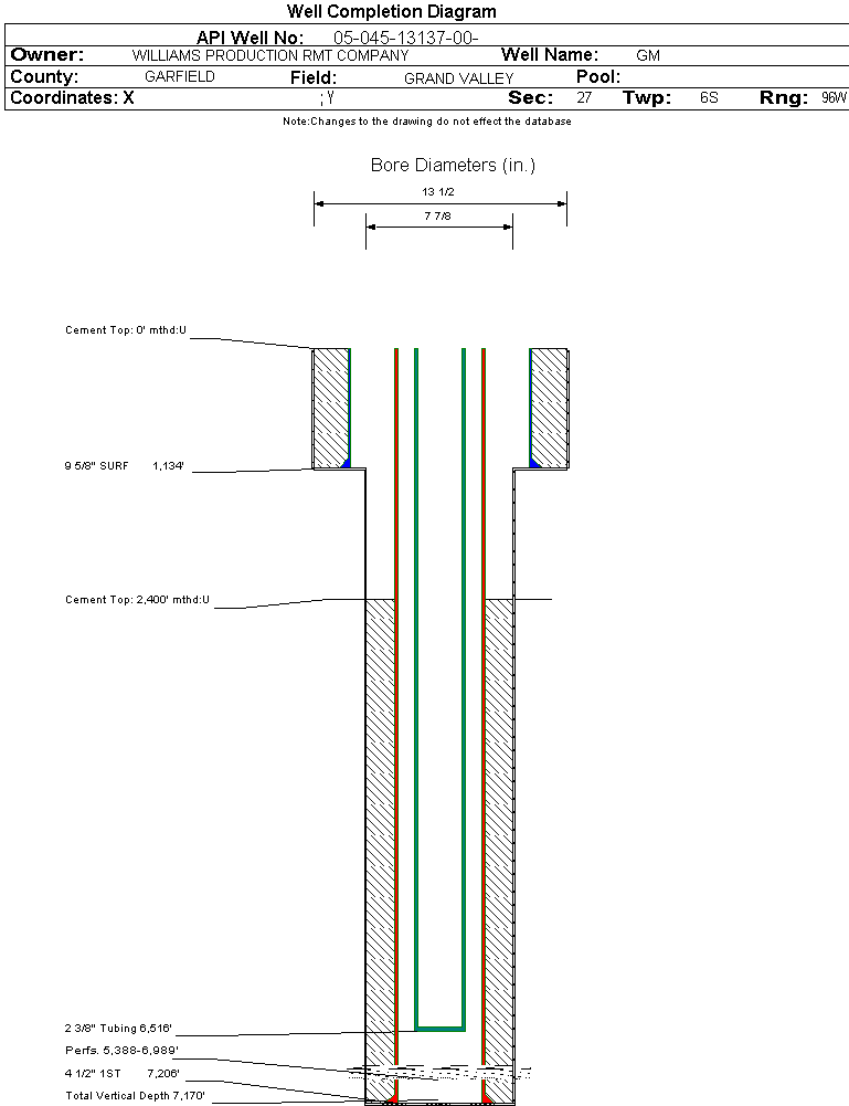 | Wellbore Completed | | Completion Date: | 2/4/2007 | | Spud Date: | 1/26/2007 | Spud Date Is: | ACTUAL | | Measured TD: | 7215 ft. | Measured PB depth: | 7182 ft. | | True Vertical TD: | 7170 ft. | True Vertical PB depth: | | | Top PZ Location: | Sec:27 Twp: 6S 96W | Footage: 1866 FNL 477 FEL | | Bottom Hole Location: | Sec:27 Twp: 6S 96W | Footage: 1866 FNL 477 FEL | | Log Types: | CBL; RESERVOIR MONITOR TOOL ELITE; MUD | | Casing: | String Type: SURF, Hole Size: 13.5 in., Size: 9.625 in., Top: 0 ft., Depth: 1134 ft., Weight: , Citings Type: ACTUAL | | Cement: | Sacks: 375, Top: 0 ft., Bottom: 1134 ft., Determination Method: | | Casing: | String Type: 1ST, Hole Size: 7.875 in., Size: 4.5 in., Top: 0 ft., Depth: 7206 ft., Weight: , Citings Type: ACTUAL | | Cement: | Sacks: 822, Top: 2400 ft., Bottom: 7206 ft., Determination Method: CBL | | Formation | Interval Top | Log Bottom | Cored | DSTs | | WASATCH G | 2147 ft. | | N | N | | MESAVERDE | 3964 ft. | | N | N | | CAMEO | 6626 ft. | | N | N | | ROLLINS | 7088 ft. | | N | N |