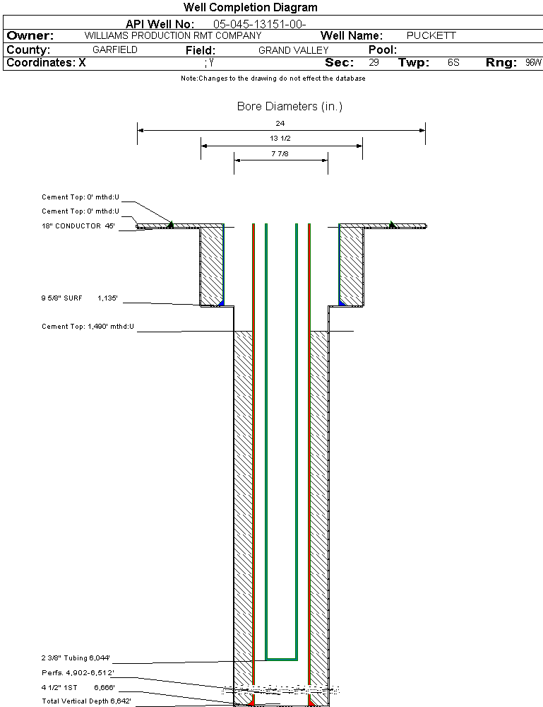| Wellbore Completed | | Completion Date: | 12/17/2007 | | Spud Date: | 12/9/2007 | Spud Date Is: | ACTUAL | | Measured TD: | 6690 ft. | Measured PB depth: | 6573 ft. | | True Vertical TD: | 6642 ft. | True Vertical PB depth: | 6525 ft. | | Top PZ Location: | Sec:29 Twp: 6S 96W | Footage: 2195 FSL 580 FEL | | Bottom Hole Location: | Sec:29 Twp: 6S 96W | Footage: 2195 FSL 580 FEL | | Log Types: | CBL;HIGH RES INDUC, SPECTRAL DENSITY,DUAL SPACED NEUTRON; MUD | | Casing: | String Type: CONDUCTOR, Hole Size: 24 in., Size: 18 in., Top: 0 ft., Depth: 45 ft., Weight: , Citings Type: ACTUAL | | Cement: | Sacks: 25, Top: 0 ft., Bottom: 45 ft., Determination Method: | | Casing: | String Type: SURF, Hole Size: 13.5 in., Size: 9.625 in., Top: 0 ft., Depth: 1135 ft., Weight: , Citings Type: ACTUAL | | Cement: | Sacks: 404, Top: 0 ft., Bottom: 1135 ft., Determination Method: | | Casing: | String Type: 1ST, Hole Size: 7.875 in., Size: 4.5 in., Top: 0 ft., Depth: 6666 ft., Weight: , Citings Type: ACTUAL | | Cement: | Sacks: 767, Top: 1490 ft., Bottom: 6666 ft., Determination Method: CBL | | Formation | Interval Top | Log Bottom | Cored | DSTs | | WASATCH G | 1852 ft. | | N | N | | MESAVERDE | 3512 ft. | | N | N | | CAMEO | 6163 ft. | | N | N | | ROLLINS | 6582 ft. | | N | N |