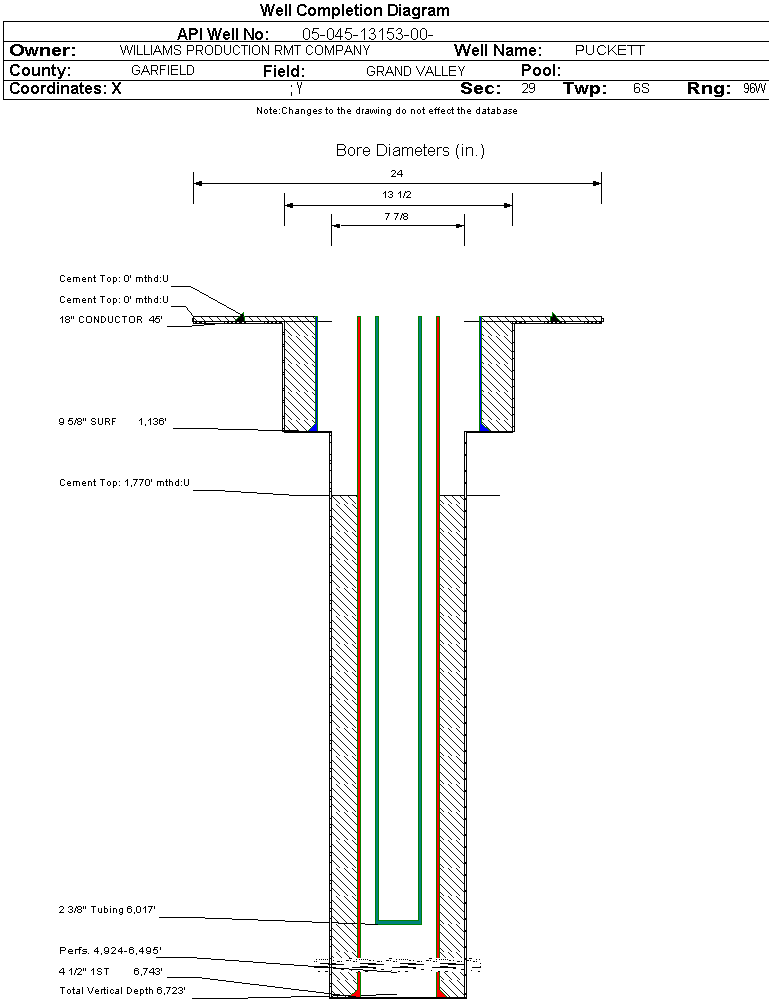 | Wellbore Completed | | Completion Date: | 1/13/2008 | | Spud Date: | 1/6/2008 | Spud Date Is: | ACTUAL | | Measured TD: | 6760 ft. | Measured PB depth: | 6710 ft. | | True Vertical TD: | 6723 ft. | True Vertical PB depth: | 6673 ft. | | Top PZ Location: | Sec:29 Twp: 6S 96W | Footage: 2457 FSL 1055 FEL | | Bottom Hole Location: | Sec:29 Twp: 6S 96W | Footage: 2457 FSL 1055 FEL | | Log Types: | CBL; RMTE | | Casing: | String Type: CONDUCTOR, Hole Size: 24 in., Size: 18 in., Top: 0 ft., Depth: 45 ft., Weight: , Citings Type: ACTUAL | | Cement: | Sacks: 25, Top: 0 ft., Bottom: 45 ft., Determination Method: CALC | | Casing: | String Type: SURF, Hole Size: 13.5 in., Size: 9.625 in., Top: 0 ft., Depth: 1136 ft., Weight: 32.3 , Citings Type: ACTUAL | | Cement: | Sacks: 290, Top: 0 ft., Bottom: 1136 ft., Determination Method: CALC | | Casing: | String Type: 1ST, Hole Size: 7.875 in., Size: 4.5 in., Top: 0 ft., Depth: 6743 ft., Weight: 11.6 , Citings Type: ACTUAL | | Cement: | Sacks: 849, Top: 1770 ft., Bottom: 6743 ft., Determination Method: CBL | | Formation | Interval Top | Log Bottom | Cored | DSTs | | WASATCH G | 1848 ft. | | N | N | | MESAVERDE | 3574 ft. | | N | N | | CAMEO | 6060 ft. | | N | N | | ROLLINS | 6565 ft. | | N | N |