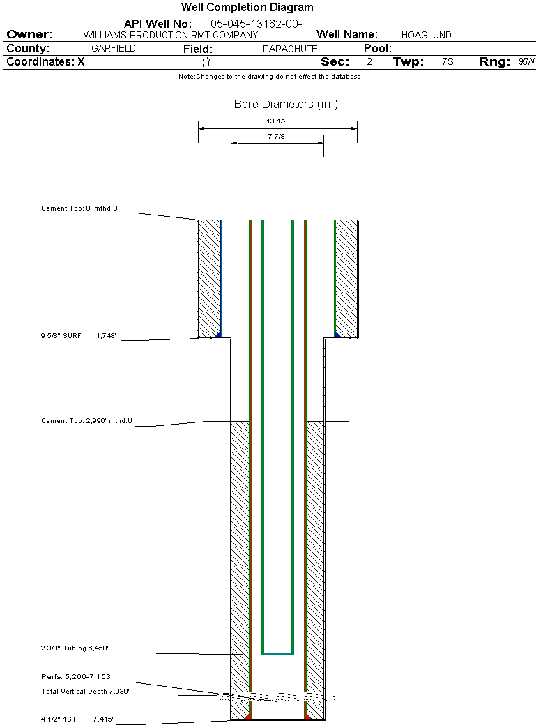 | Wellbore Completed | | Completion Date: | 1/24/2007 | | Spud Date: | 1/8/2007 | Spud Date Is: | ACTUAL | | Measured TD: | 7416 ft. | Measured PB depth: | 7314 ft. | | True Vertical TD: | 7030 ft. | True Vertical PB depth: | | | Top PZ Location: | Sec:2 Twp: 7S 95W | Footage: 2071 FNL 2176 FWL | | Bottom Hole Location: | Sec:2 Twp: 7S 95W | Footage: 2071 FNL 2176 FWL | | Log Types: | CBL; RESERVOIR MONITOR TOOL ELITE; MUDLOG | | Casing: | String Type: SURF, Hole Size: 13.5 in., Size: 9.625 in., Top: 0 ft., Depth: 1748 ft., Weight: 32.3 , Citings Type: ACTUAL | | Cement: | Sacks: 461, Top: 0 ft., Bottom: 1748 ft., Determination Method: CALC | | Casing: | String Type: 1ST, Hole Size: 7.875 in., Size: 4.5 in., Top: 0 ft., Depth: 7415 ft., Weight: 11.6 , Citings Type: ACTUAL | | Cement: | Sacks: 905, Top: 2990 ft., Bottom: 7415 ft., Determination Method: CBL | | Formation | Interval Top | Log Bottom | Cored | DSTs | | WASATCH G | 1484 ft. | | N | N | | MESAVERDE | 3940 ft. | | N | N | | CAMEO | 6560 ft. | | N | N | | ROLLINS | 7226 ft. | | N | N |