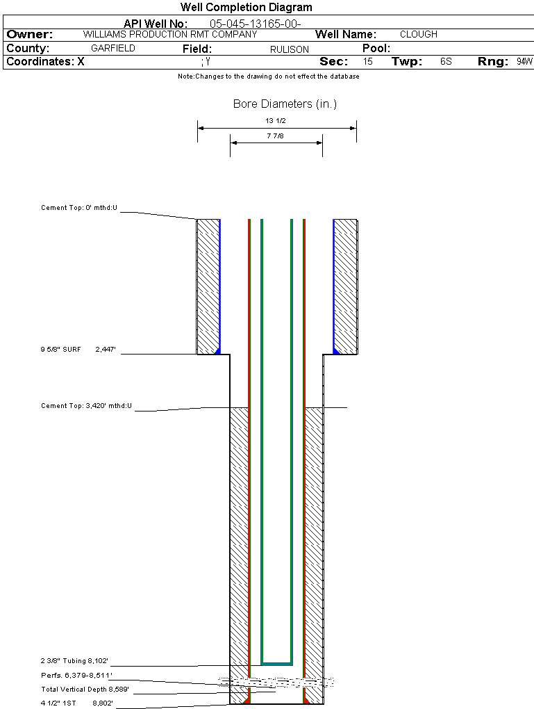 Wellbore #00 Wellbore Classification: GW Status: PR - 10/10/2006 Measured TD: 8842 ft. Vertical TD: 8589 ft.| Wellbore Data for Original Wellbore | Wellbore Classification: GW PR - 10/10/2006 | | Wellbore Permit | DIRECTIONAL | | Permit #: | 20065229 | Expiration Date: | 11/29/2007 | | Proposed Top PZ Location: | Sec: Twp: | Footage: 2375 FSL 669 FEL | | Bottom Hole Location: | Sec:16 Twp: 6S 94W | Footage: 2375 FSL 669 FEL | | Proposed Depth/Form: | 8815 ft. | | Surface Mineral Owner Same: | Yes | | Mineral Owner: | FEE | Surface Owner: | FEE | | Unit: | | Unit Number: | | | Formation And Spacing: | Code: WMFK , Formation: WILLIAMS FORK , Order: 139-38 , Unit Acreage: 320, Drill Unit: E2 |