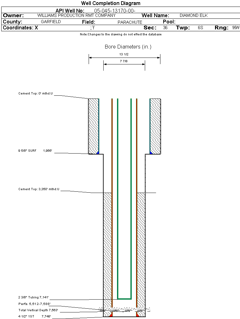 Wellbore #00 Wellbore Classification: GW Status: PR - 10/9/2006 Measured TD: 7759 ft. Vertical TD: 7563 ft.| Wellbore Data for Original Wellbore | Wellbore Classification: GW PR - 10/9/2006 | | Wellbore Permit | DIRECTIONAL | | Permit #: | 20065231 | Expiration Date: | 12/4/2007 | | Proposed Top PZ Location: | Sec: Twp: | Footage: 204 FSL 1745 FWL | | Bottom Hole Location: | Sec:36 Twp: 6S 95W | Footage: 204 FSL 1745 FWL | | Proposed Depth/Form: | 7765 ft. | | Surface Mineral Owner Same: | Yes | | Mineral Owner: | FEE | Surface Owner: | FEE | | Unit: | | Unit Number: | | | Formation And Spacing: | Code: WMFK , Formation: WILLIAMS FORK , Order: 440-35 , Unit Acreage: 320, Drill Unit: S2 |