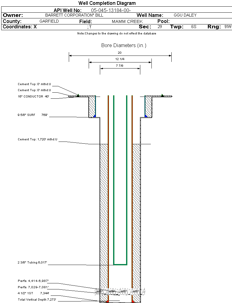 | | Perforation Data: | | Interval Top: | 7029 ft. | # Of Holes: | 14 | | Interval Bottom: | 7081 ft. | Hole Size: | 0.34 in. |