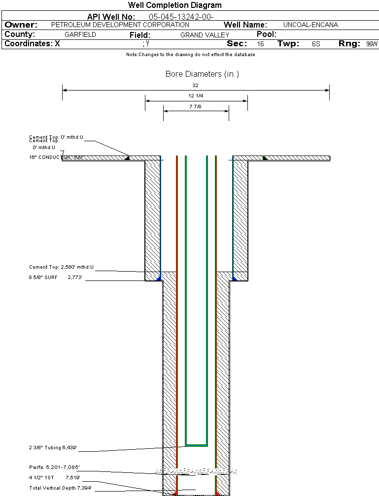 | Wellbore Completed | | Completion Date: | 4/20/2007 | | Spud Date: | 4/10/2007 | Spud Date Is: | ACTUAL | | Measured TD: | 7540 ft. | Measured PB depth: | 7404 ft. | | True Vertical TD: | 7394 ft. | True Vertical PB depth: | 7258 ft. | | Top PZ Location: | Sec:16 Twp: 6S 96W | Footage: 311 FSL 712 FWL | | Bottom Hole Location: | Sec:16 Twp: 6S 96W | Footage: 311 FSL 712 FWL | | Log Types: | PNDL/GR, PND-S CASED HOLE TRIPLE COMBO, CBL/GR; MUDLOG | | Casing: | String Type: CONDUCTOR, Hole Size: 32 in., Size: 16 in., Top: 0 ft., Depth: 100 ft., Weight: , Citings Type: ACTUAL | | Cement: | Sacks: 100, Top: 0 ft., Bottom: 100 ft., Determination Method: CALC | | Casing: | String Type: SURF, Hole Size: 12.25 in., Size: 8.625 in., Top: 0 ft., Depth: 2773 ft., Weight: , Citings Type: ACTUAL | | Cement: | Sacks: 1063, Top: 0 ft., Bottom: 2773 ft., Determination Method: CALC | | Casing: | String Type: 1ST, Hole Size: 7.875 in., Size: 4.5 in., Top: 0 ft., Depth: 7519 ft., Weight: , Citings Type: ACTUAL | | Cement: | Sacks: 900, Top: 2580 ft., Bottom: 7519 ft., Determination Method: CBL | | Formation | Interval Top | Log Bottom | Cored | DSTs | | WASATCH G | 2425 ft. | | N | N | | FORT UNION | 2762 ft. | | N | N | | WILLIAMS FORK | 4220 ft. | | N | N | | CAMEO | 6894 ft. | | N | N | | ROLLINS | 7344 ft. | | N | N |