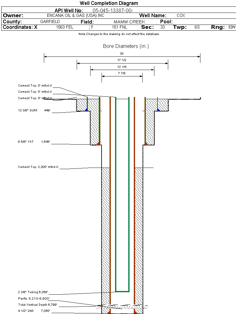 | Wellbore Completed | | Completion Date: | 4/13/2005 | | Spud Date: | 1/16/2005 | Spud Date Is: | ACTUAL | | Measured TD: | 7050 ft. | Measured PB depth: | 7000 ft. | | True Vertical TD: | 6799 ft. | True Vertical PB depth: | 0 ft. | | Top PZ Location: | Sec:33 Twp: 6S 92W | Footage: 660 FNL 2500 FWL | | Bottom Hole Location: | Sec:33 Twp: 6S 92W | Footage: 660 FNL 2500 FWL | | Log Types: | PEX, CBL, CMTT | | Casing: | String Type: CONDUCTOR, Hole Size: 30 in., Size: 16 in., Top: 0 ft., Depth: 60 ft., Weight: 0 , Citings Type: ACTUAL | | Cement: | Sacks: 8, Top: 0 ft., Bottom: 60 ft., Determination Method: CALC | | Casing: | String Type: SURF, Hole Size: 17.5 in., Size: 13.375 in., Top: 0 ft., Depth: 449 ft., Weight: 48 , Citings Type: ACTUAL | | Cement: | Sacks: 475, Top: 0 ft., Bottom: 450 ft., Determination Method: CALC | | Casing: | String Type: 1ST, Hole Size: 12.25 in., Size: 8.625 in., Top: 0 ft., Depth: 1548 ft., Weight: 24 , Citings Type: ACTUAL | | Cement: | Sacks: 950, Top: 0 ft., Bottom: 1550 ft., Determination Method: CALC | | Casing: | String Type: 2ND, Hole Size: 7.875 in., Size: 4.5 in., Top: 0 ft., Depth: 7050 ft., Weight: 11.6 , Citings Type: ACTUAL | | Cement: | Sacks: 1660, Top: 2300 ft., Bottom: 7050 ft., Determination Method: CALC | | Formation | Interval Top | Log Bottom | Cored | DSTs | | WASATCH | 0 ft. | 3816 ft. | N | N | | WILLIAMS FORK | 3817 ft. | 6969 ft. | N | N | | ROLLINS | 6970 ft. | 7050 ft. | N | N |