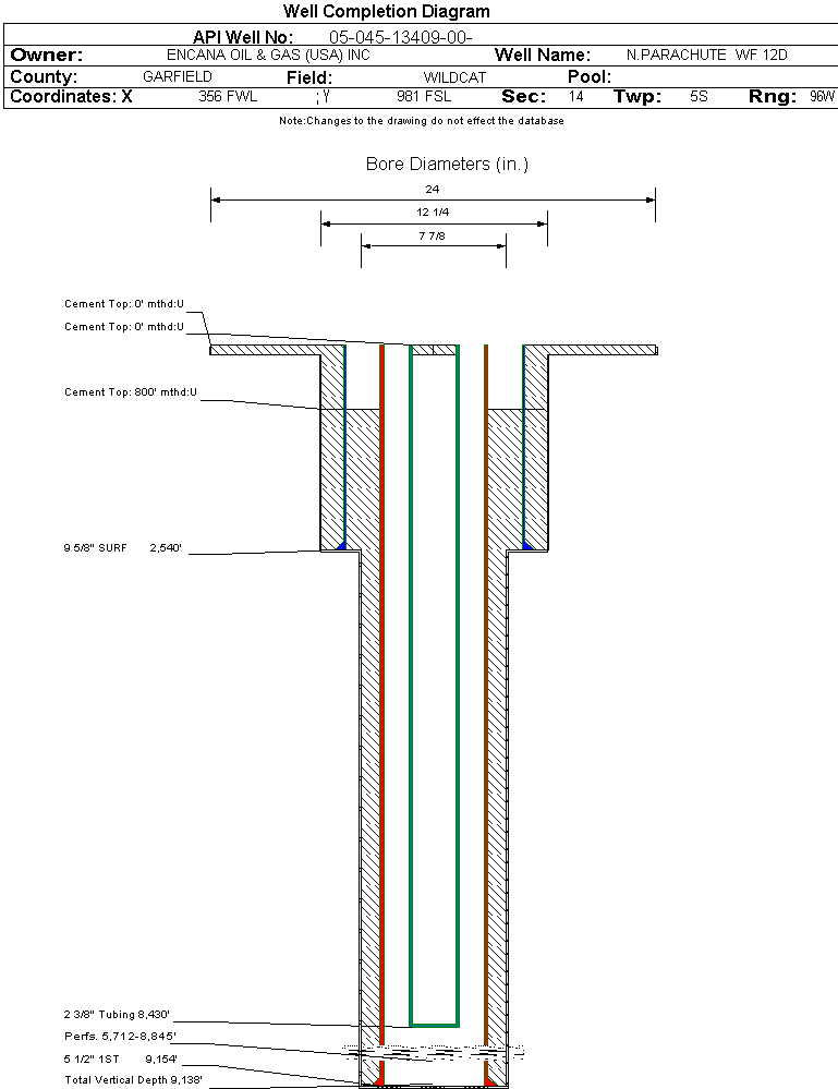 | Wellbore Completed | | Completion Date: | 4/19/2005 | | Spud Date: | 3/24/2005 | Spud Date Is: | ACTUAL | | Measured TD: | 9210 ft. | Measured PB depth: | 8948 ft. | | True Vertical TD: | 9138 ft. | True Vertical PB depth: | 8877 ft. | | Top PZ Location: | Sec:14 Twp: 5S 96W | Footage: 1650 FSL 990 FWL | | Bottom Hole Location: | Sec:14 Twp: 5S 96W | Footage: 1650 FSL 990 FWL | | Log Types: | | | Casing: | String Type: CONDUCTOR, Hole Size: 24 in., Size: 16 in., Top: 0 ft., Depth: 110 ft., Weight: 0 , Citings Type: ACTUAL | | Cement: | Sacks: , Top: 0 ft., Bottom: 110 ft., Determination Method: CALC | | Casing: | String Type: SURF, Hole Size: 12.25 in., Size: 9.625 in., Top: 0 ft., Depth: 2540 ft., Weight: 36 , Citings Type: ACTUAL | | Cement: | Sacks: 780, Top: 0 ft., Bottom: 2550 ft., Determination Method: CALC | | Casing: | String Type: 1ST, Hole Size: 7.875 in., Size: 5.5 in., Top: 0 ft., Depth: 9154 ft., Weight: 17 , Citings Type: ACTUAL | | Cement: | Sacks: 1705, Top: 800 ft., Bottom: 9154 ft., Determination Method: CBL | | Formation | Interval Top | Log Bottom | Cored | DSTs | | WILLIAMS FORK | 5510 ft. | 9041 ft. | N | N | | ROLLINS | 9042 ft. | 9210 ft. | N | N |