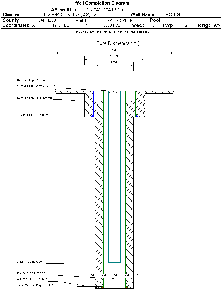 | Wellbore Completed | | Completion Date: | 2/26/2005 | | Spud Date: | 2/10/2005 | Spud Date Is: | ACTUAL | | Measured TD: | 7676 ft. | Measured PB depth: | 7543 ft. | | True Vertical TD: | 7582 ft. | True Vertical PB depth: | | | Top PZ Location: | Sec:13 Twp: 7S 93W | Footage: 2400 FSL 2420 FWL | | Bottom Hole Location: | Sec:13 Twp: 7S 93W | Footage: 2400 FSL 2420 FWL | | Log Types: | PEX, RST, CBL | | Casing: | String Type: CONDUCTOR, Hole Size: 24 in., Size: 16 in., Top: 0 ft., Depth: 80 ft., Weight: 42 , Citings Type: ACTUAL | | Cement: | Sacks: 320, Top: 0 ft., Bottom: 80 ft., Determination Method: CALC | | Casing: | String Type: SURF, Hole Size: 12.25 in., Size: 8.625 in., Top: 0 ft., Depth: 1004 ft., Weight: 24 , Citings Type: ACTUAL | | Cement: | Sacks: 720, Top: 0 ft., Bottom: 1004 ft., Determination Method: CALC | | Casing: | String Type: 1ST, Hole Size: 7.875 in., Size: 4.5 in., Top: 0 ft., Depth: 7676 ft., Weight: 11.6 , Citings Type: ACTUAL | | Cement: | Sacks: 1770, Top: 400 ft., Bottom: 7676 ft., Determination Method: CALC | | Formation | Interval Top | Log Bottom | Cored | DSTs | | WASATCH | 0 ft. | 4506 ft. | N | N | | WILLIAMS FORK | 4507 ft. | 7552 ft. | N | N | | ROLLINS | 7553 ft. | 7676 ft. | N | N |