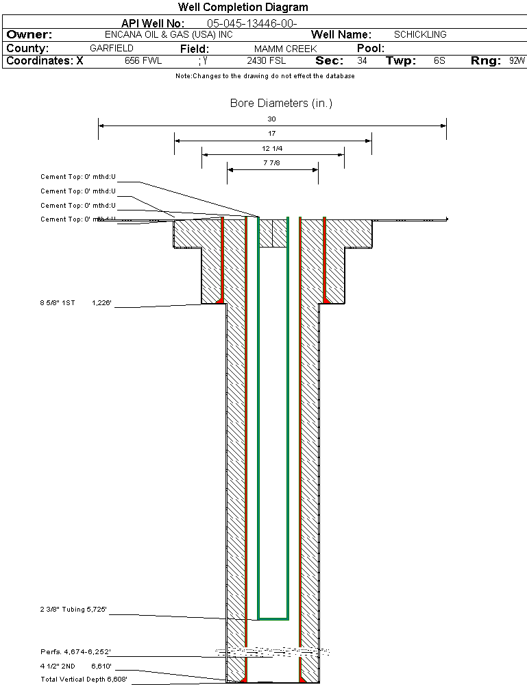 | Wellbore Completed | | Completion Date: | 5/19/2005 | | Spud Date: | 3/10/2005 | Spud Date Is: | ACTUAL | | Measured TD: | 6617 ft. | Measured PB depth: | 6506 ft. | | True Vertical TD: | 6608 ft. | True Vertical PB depth: | | | Top PZ Location: | Sec: Twp: | Footage: 2630 FNL 650 FWL | | Bottom Hole Location: | Sec: Twp: | Footage: 2630 FNL 650 FWL | | Log Types: | CBL, PEX | | Casing: | String Type: CONDUCTOR, Hole Size: 30 in., Size: 16 in., Top: 0 ft., Depth: 40 ft., Weight: 54 , Citings Type: ACTUAL | | Cement: | Sacks: 6, Top: 0 ft., Bottom: 40 ft., Determination Method: | | Casing: | String Type: SURF, Hole Size: 17 in., Size: 13 in., Top: 0 ft., Depth: 431 ft., Weight: 48 , Citings Type: ACTUAL | | Cement: | Sacks: 480, Top: 0 ft., Bottom: 431 ft., Determination Method: CALC | | Casing: | String Type: 1ST, Hole Size: 12.25 in., Size: 8.625 in., Top: 0 ft., Depth: 1226 ft., Weight: 24 , Citings Type: ACTUAL | | Cement: | Sacks: 744, Top: 0 ft., Bottom: 1230 ft., Determination Method: CALC | | Casing: | String Type: 2ND, Hole Size: 7.875 in., Size: 4.5 in., Top: 0 ft., Depth: 6610 ft., Weight: 11.6 , Citings Type: ACTUAL | | Cement: | Sacks: 1465, Top: 0 ft., Bottom: 6617 ft., Determination Method: CALC | | Formation | Interval Top | Log Bottom | Cored | DSTs | | WASATCH | 0 ft. | 3402 ft. | N | N | | WILLIAMS FORK | 3403 ft. | 6533 ft. | N | N | | ROLLINS | 6534 ft. | 6617 ft. | N | N |