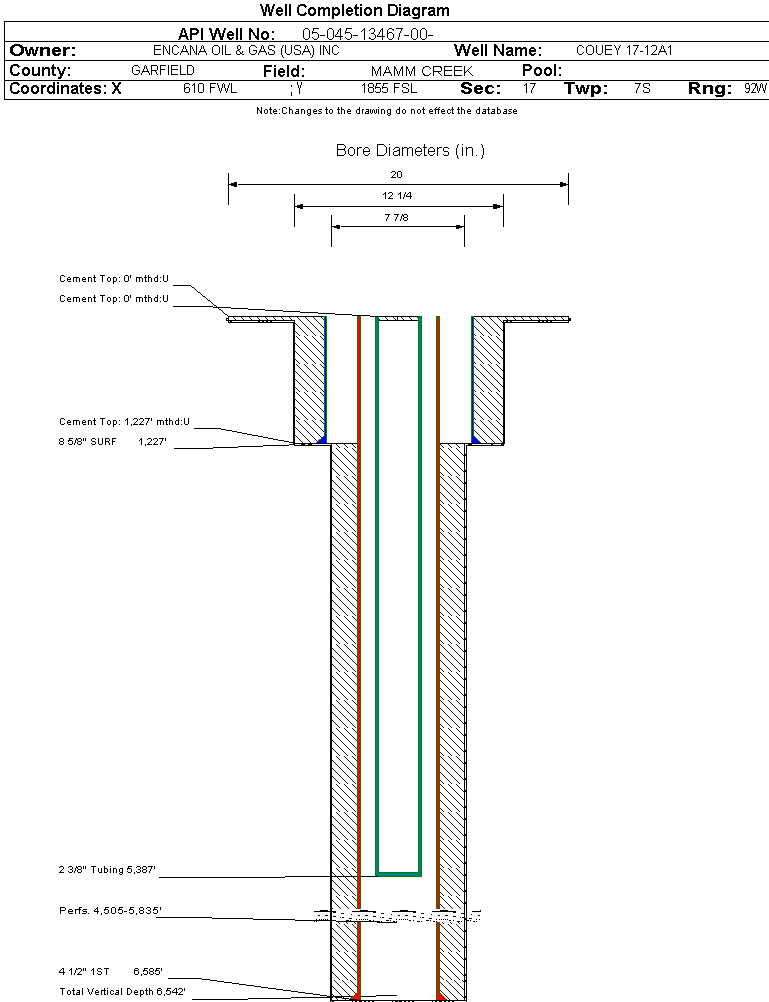 | Wellbore Completed | | Completion Date: | 4/28/2005 | | Spud Date: | 4/17/2005 | Spud Date Is: | ACTUAL | | Measured TD: | 6591 ft. | Measured PB depth: | 6135 ft. | | True Vertical TD: | 6542 ft. | True Vertical PB depth: | | | Top PZ Location: | Sec: Twp: | Footage: 2250 FSL 1000 FWL | | Bottom Hole Location: | Sec: Twp: | Footage: 2250 FSL 1000 FWL | | Log Types: | PEX,CBL/GR/TEMP | | Casing: | String Type: CONDUCTOR, Hole Size: 20 in., Size: 16 in., Top: 0 ft., Depth: 40 ft., Weight: 42 , Citings Type: ACTUAL | | Cement: | Sacks: , Top: 0 ft., Bottom: 40 ft., Determination Method: CALC | | Casing: | String Type: SURF, Hole Size: 12.25 in., Size: 8.625 in., Top: 0 ft., Depth: 1227 ft., Weight: 24 , Citings Type: ACTUAL | | Cement: | Sacks: 860, Top: 0 ft., Bottom: 1227 ft., Determination Method: CALC | | Casing: | String Type: 1ST, Hole Size: 7.875 in., Size: 4.5 in., Top: 0 ft., Depth: 6585 ft., Weight: 11.6 , Citings Type: ACTUAL | | Cement: | Sacks: 1075, Top: 1227 ft., Bottom: 6585 ft., Determination Method: CALC | | Formation | Interval Top | Log Bottom | Cored | DSTs | | WASATCH | 0 ft. | 3590 ft. | N | N | | WILLIAMS FORK | 3591 ft. | 6591 ft. | N | N |