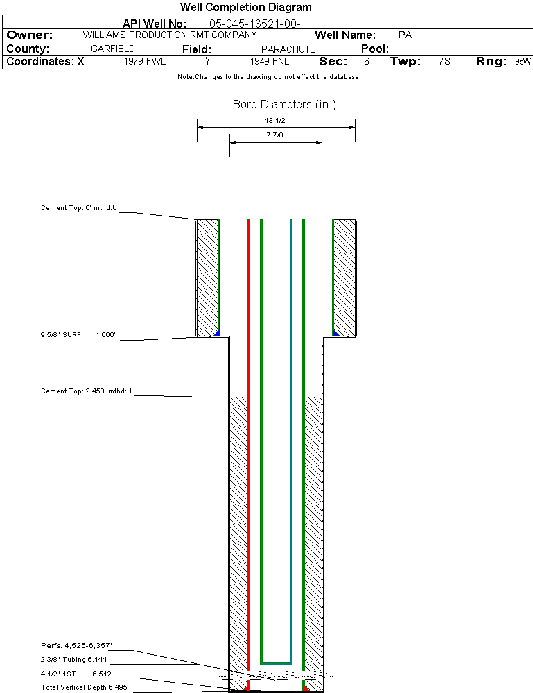 Wellbore #00 Wellbore Classification: GW Status: PR - 7/6/2005 Measured TD: 6513 ft. Vertical TD: 6495 ft.| Wellbore Data for Original Wellbore | Wellbore Classification: GW PR - 7/6/2005 | | Wellbore Permit | DIRECTIONAL | | Permit #: | 20043025 | Expiration Date: | 12/27/2005 | | Proposed Top PZ Location: | Sec: Twp: | Footage: 2321 FNL 1920 FWL | | Bottom Hole Location: | Sec: Twp: | Footage: 2312 FNL 1920 FWL | | Proposed Depth/Form: | 6572 ft. | | Surface Mineral Owner Same: | Yes | | Mineral Owner: | FEE | Surface Owner: | FEE | | Unit: | | Unit Number: | | | Formation And Spacing: | Code: WMFK , Formation: WILLIAMS FORK , Order: 139-38 , Unit Acreage: 160, Drill Unit: NW4 |