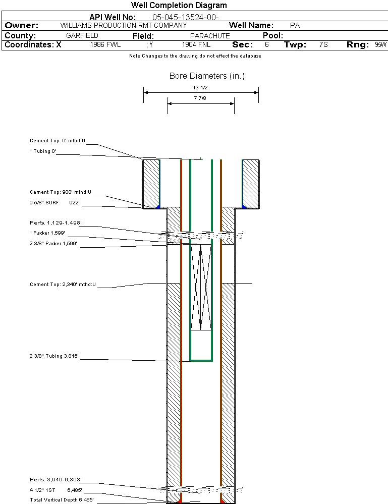 Wellbore #00 Wellbore Classification: GW Status: PR - 7/31/2005 Measured TD: 6500 ft. Vertical TD: 6465 ft.| Wellbore Data for Original Wellbore | Wellbore Classification: GW PR - 7/31/2005 | | Wellbore Permit | DIRECTIONAL | | Permit #: | 20050474 | Expiration Date: | 3/6/2006 | | Proposed Top PZ Location: | Sec: Twp: | Footage: 1415 FNL 1786 FWL | | Bottom Hole Location: | Sec: Twp: | Footage: 1415 FNL 1786 FWL | | Proposed Depth/Form: | 6604 ft. | | Surface Mineral Owner Same: | Yes | | Mineral Owner: | FEE | Surface Owner: | FEE | | Unit: | | Unit Number: | | | Formation And Spacing: | Code: WMFK , Formation: WILLIAMS FORK , Order: 139-39,440, Unit Acreage: 160, Drill Unit: NW/4 | | Formation And Spacing: | Code: WSTC , Formation: WASATCH , Order: 440-1 , Unit Acreage: 160, Drill Unit: NW/4 |