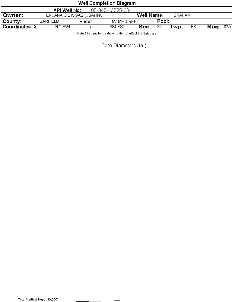 Wellbore #00 Wellbore Classification: Status: AL - 12/1/2004 Measured TD: | Wellbore Data for Original Wellbore | Wellbore Classification: AL - 12/1/2004 | | Wellbore Permit | DIRECTIONAL | | Permit #: | 20043038 | Expiration Date: | 12/27/2005 | | Proposed Top PZ Location: | Sec: Twp: | Footage: 150 FSL 340 FWL | | Bottom Hole Location: | Sec:32 Twp: | Footage: 150 FSL 340 FWL | | Proposed Depth/Form: | 7026 ft. | | Surface Mineral Owner Same: | Yes | | Mineral Owner: | FEE | Surface Owner: | FEE | | Unit: | GRASS MESA UNIT | Unit Number: | COC 56608X | | Formation And Spacing: | Code: ILES , Formation: ILES , Order: 139-42 , Unit Acreage: , Drill Unit: | | Formation And Spacing: | Code: WMFK , Formation: WILLIAMS FORK , Order: 139-42 , Unit Acreage: , Drill Unit: | | Casing: | String Type: CONDUCTOR, Hole Size: 24 in., Size: 16 in., Top: , Depth: 40 ft., Weight: , Citings Type: PLANNED | | Cement: | Sacks: 5, Top: 0 ft., Bottom: 40 ft. | | Casing: | String Type: SURF, Hole Size: 12.25 in., Size: 8.625 in., Top: , Depth: 750 ft., Weight: 24 , Citings Type: PLANNED | | Cement: | Sacks: 405, Top: 0 ft., Bottom: 750 ft. | | Casing: | String Type: 1ST, Hole Size: 7.875 in., Size: 4.5 in., Top: , Depth: 7026 ft., Weight: 11.6 , Citings Type: PLANNED | | Cement: | Sacks: 460, Top: 500 ft., Bottom: 7026 ft. |