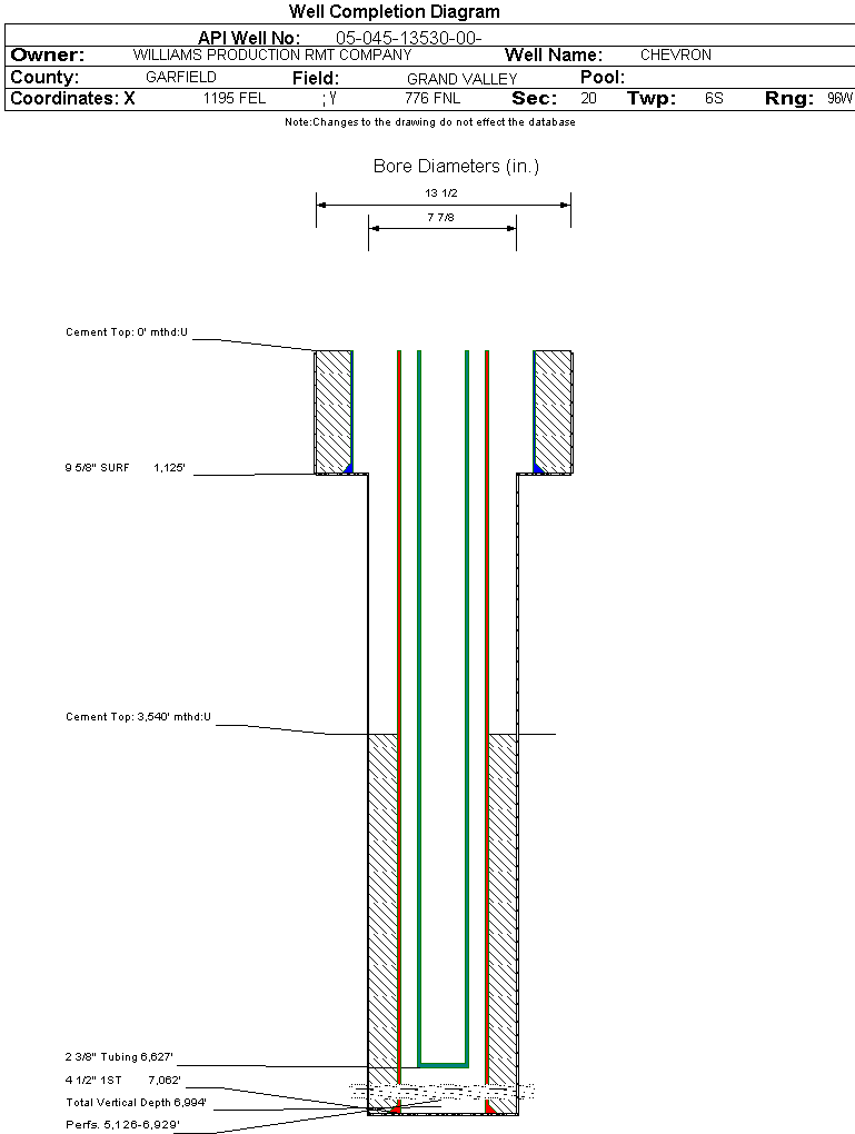 Wellbore #00 Wellbore Classification: OW Status: PR - 1/1/2019 Measured TD: 7075 ft. Vertical TD: 6994 ft.| Wellbore Data for Original Wellbore | Wellbore Classification: OW PR - 1/1/2019 | | Wellbore Permit | DIRECTIONAL | | Permit #: | 20043059 | Expiration Date: | 12/28/2005 | | Proposed Top PZ Location: | Sec: Twp: | Footage: 464 FNL 365 FEL | | Bottom Hole Location: | Sec: Twp: | Footage: 464 FNL 365 FEL | | Proposed Depth/Form: | 7080 ft. | | Surface Mineral Owner Same: | Yes | | Mineral Owner: | FEE | Surface Owner: | FEE | | Unit: | | Unit Number: | | | Formation And Spacing: | Code: WMFK , Formation: WILLIAMS FORK , Order: 139-38 , Unit Acreage: 320, Drill Unit: N2 |