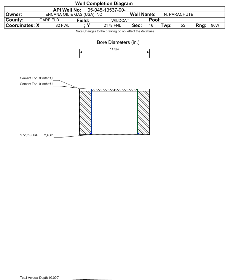 | Wellbore Completed | | Completion Date: | 9/9/2007 | | Spud Date: | 9/3/2007 | Spud Date Is: | ACTUAL | | Measured TD: | 2400 ft. | Measured PB depth: | | | True Vertical TD: | | True Vertical PB depth: | | | Bottom Hole Location: | Sec:16 Twp: 5S 96W | Footage: 1650 FSL 990 FWL | | Log Types: | NONE | | Casing: | String Type: CONDUCTOR, Hole Size: , Size: , Top: , Depth: 120 ft., Weight: 53 , Citings Type: ACTUAL | | Cement: | Sacks: 140, Top: 0 ft., Bottom: 120 ft., Determination Method: VISU | | Casing: | String Type: SURF, Hole Size: 14.75 in., Size: 9.625 in., Top: , Depth: 2400 ft., Weight: 36 , Citings Type: ACTUAL | | Cement: | Sacks: 953, Top: 0 ft., Bottom: 2400 ft., Determination Method: VISU | | No formation data to display. |