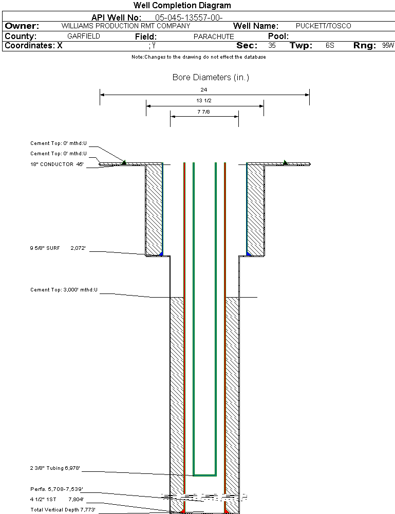 | Wellbore Completed | | Completion Date: | 6/27/2007 | | Spud Date: | 6/14/2007 | Spud Date Is: | ACTUAL | | Measured TD: | 7820 ft. | Measured PB depth: | 7779 ft. | | True Vertical TD: | 7773 ft. | True Vertical PB depth: | | | Top PZ Location: | Sec:26 Twp: 6S 95W | Footage: 299 FSL 770 FEL | | Bottom Hole Location: | Sec:26 Twp: 6S 95W | Footage: 299 FSL 770 FEL | | Log Types: | CBL; HIGH RESOLUTION IND/SPECTRAL DENS/DUAL SPACED NEU; MUDLOG | | Casing: | String Type: CONDUCTOR, Hole Size: 24 in., Size: 18 in., Top: 0 ft., Depth: 45 ft., Weight: 48 , Citings Type: ACTUAL | | Cement: | Sacks: 25, Top: 0 ft., Bottom: 45 ft., Determination Method: CALC | | Casing: | String Type: SURF, Hole Size: 13.5 in., Size: 9.625 in., Top: 0 ft., Depth: 2072 ft., Weight: 32.3 , Citings Type: ACTUAL | | Cement: | Sacks: 551, Top: 0 ft., Bottom: 2072 ft., Determination Method: CALC | | Casing: | String Type: 1ST, Hole Size: 7.875 in., Size: 4.5 in., Top: 0 ft., Depth: 7804 ft., Weight: 11.6 , Citings Type: ACTUAL | | Cement: | Sacks: 1263, Top: 3000 ft., Bottom: 7804 ft., Determination Method: CBL | | Formation | Interval Top | Log Bottom | Cored | DSTs | | WASATCH G | 1847 ft. | | N | N | | FORT UNION | 2137 ft. | | N | N | | MESAVERDE | 4191 ft. | | N | N | | CAMEO | 6962 ft. | | N | N | | ROLLINS | 7631 ft. | | N | N |