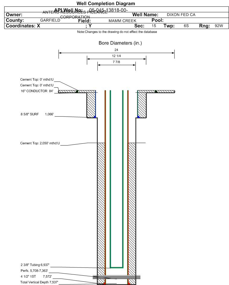 Wellbore #00 Wellbore Classification: GW Status: PR - 2/1/2022 Measured TD: 7582 ft. Vertical TD: 7537 ft.| Wellbore Data for Original Wellbore | Wellbore Classification: GW PR - 2/1/2022 | | Wellbore Permit | DIRECTIONAL | | Permit #: | | Expiration Date: | 2/17/2013 | | Proposed Top PZ Location: | Sec:15 Twp: 6S 92W | Footage: 2210 FSL 653 FWL | | Bottom Hole Location: | Sec:15 Twp: 6S 92W | Footage: 2210 FSL 653 FWL | | Proposed Depth/Form: | 7622 ft. | | Surface Mineral Owner Same: | Yes | | Mineral Owner: | FEE | Surface Owner: | FEE | | Unit: | | Unit Number: | | | Formation And Spacing: | Code: ILES , Formation: ILES , Order: 191-25 , Unit Acreage: 320, Drill Unit: S/2 | | Formation And Spacing: | Code: WMFK , Formation: WILLIAMS FORK , Order: 191-24 , Unit Acreage: 320, Drill Unit: S/2 | | Casing: | String Type: CONDUCTOR, Hole Size: 24 in., Size: 16 in., Top: 0 ft., Depth: 60 ft., Weight: 55# , Citings Type: PLANNED | | Cement: | Sacks: 177, Top: 0 ft., Bottom: 60 ft. | | Casing: | String Type: SURF, Hole Size: 12.25 in., Size: 8.625 in., Top: 0 ft., Depth: 1000 ft., Weight: 24/32# , Citings Type: PLANNED | | Cement: | Sacks: 416, Top: 0 ft., Bottom: 1000 ft. | | Casing: | String Type: 1ST, Hole Size: 7.875 in., Size: 4.5 in., Top: 0 ft., Depth: 7622 ft., Weight: 11.6# , Citings Type: PLANNED | | Cement: | Sacks: 356, Top: , Bottom: 7622 ft. |
