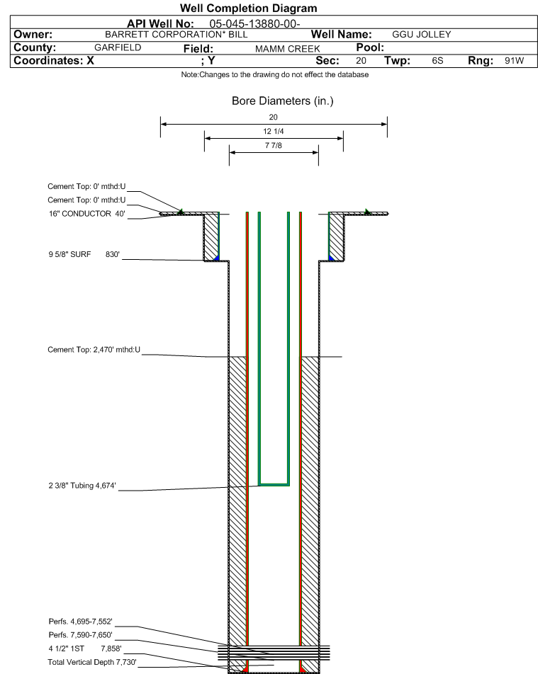 | Wellbore Completed | | Completion Date: | 4/29/2007 | | Spud Date: | 4/18/2007 | Spud Date Is: | ACTUAL | | Measured TD: | 7890 ft. | Measured PB depth: | 7815 ft. | | True Vertical TD: | 7730 ft. | True Vertical PB depth: | 7655 ft. | | Top PZ Location: | Sec:20 Twp: 6S 91W | Footage: 2429 FSL 673 FEL | | Bottom Hole Location: | Sec:20 Twp: 6S 91W | Footage: 2429 FSL 673 FEL | | Log Types: | HALLIBURTON HRI/SD/DSN; SCHLUMBERGER CBL/GR/VDL; WEATHERFORD TEMP LOG, MUD, DSN/SD | | Casing: | String Type: CONDUCTOR, Hole Size: 20 in., Size: 16 in., Top: , Depth: 40 ft., Weight: , Citings Type: ACTUAL | | Cement: | Sacks: , Top: , Bottom: 40 ft., Determination Method: | | Casing: | String Type: SURF, Hole Size: 12.25 in., Size: 9.625 in., Top: 0 ft., Depth: 830 ft., Weight: , Citings Type: ACTUAL | | Cement: | Sacks: 240, Top: 0 ft., Bottom: 830 ft., Determination Method: | | Casing: | String Type: 1ST, Hole Size: 7.875 in., Size: 4.5 in., Top: 0 ft., Depth: 7858 ft., Weight: , Citings Type: ACTUAL | | Cement: | Sacks: 900, Top: 2470 ft., Bottom: 7858 ft., Determination Method: CBL | | Formation | Interval Top | Log Bottom | Cored | DSTs | | WILLIAMS FORK | 3980 ft. | | N | N | | ROLLINS | 7562 ft. | | N | N |