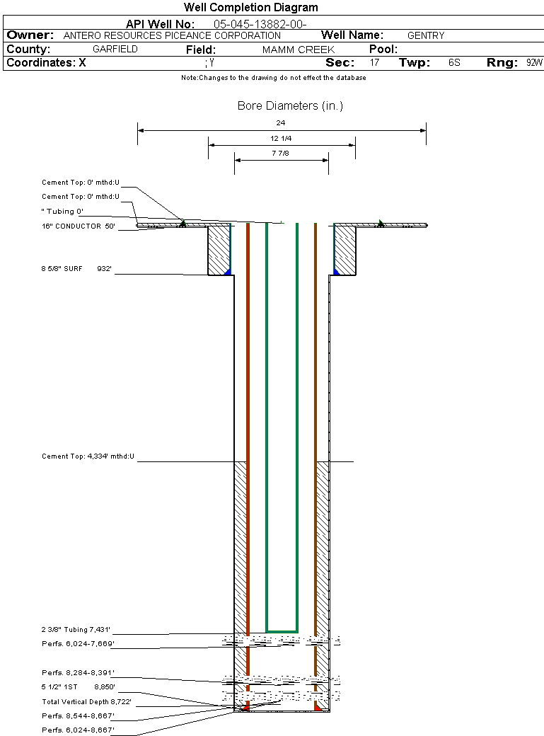 Wellbore #00 Wellbore Classification: GW Status: PR - 10/12/2007 Measured TD: 8805 ft. Vertical TD: 8722 ft.| Wellbore Data for Original Wellbore | Wellbore Classification: GW PR - 10/12/2007 | | Wellbore Permit | DIRECTIONAL | | Permit #: | 20070831 | Expiration Date: | 3/21/2008 | | Proposed Top PZ Location: | Sec: Twp: | Footage: 2166 FSL 1885 FWL | | Bottom Hole Location: | Sec:17 Twp: 6S 92W | Footage: 2166 FSL 1885 FWL | | Proposed Depth/Form: | 8776 ft. | | Surface Mineral Owner Same: | Yes | | Mineral Owner: | FEE | Surface Owner: | FEE | | Unit: | | Unit Number: | | | Formation And Spacing: | Code: ILES , Formation: ILES , Order: 191-25 , Unit Acreage: 320, Drill Unit: S2 | | Formation And Spacing: | Code: WMFK , Formation: WILLIAMS FORK , Order: 191-24 , Unit Acreage: 320, Drill Unit: S2 |