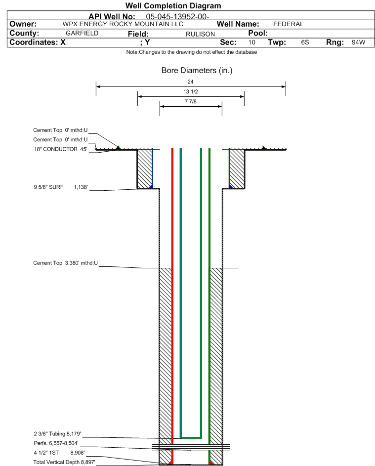 | | Perforation Data: | | Interval Top: | 6557 ft. | # Of Holes: | 95 | | Interval Bottom: | 8504 ft. | Hole Size: | 0.35 in. |