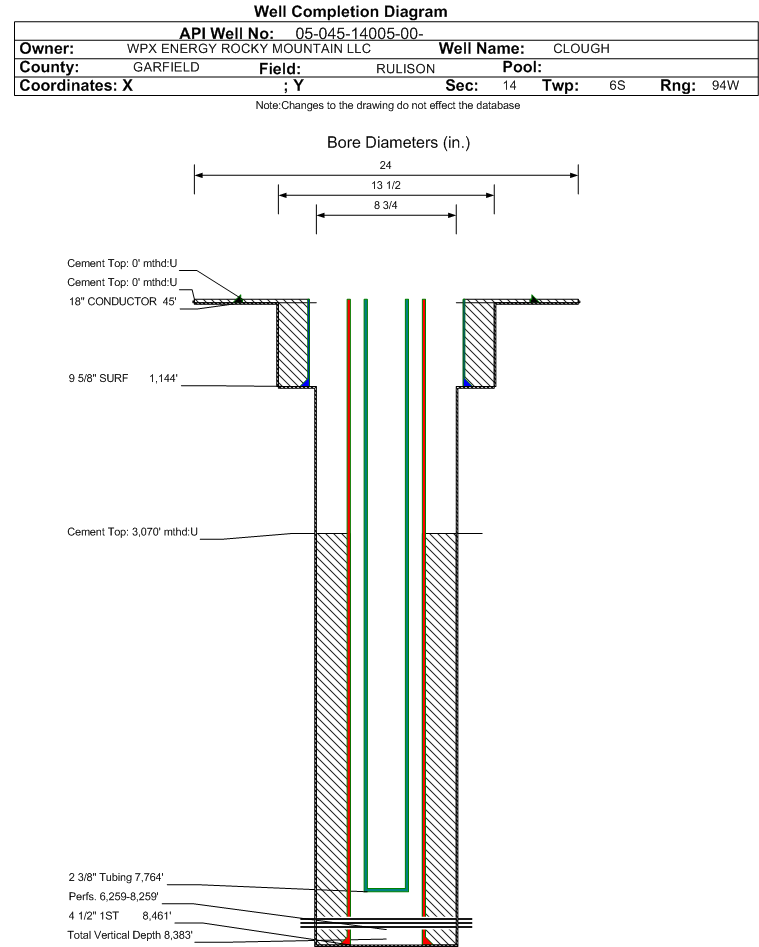 | Wellbore Completed | | Completion Date: | 4/21/2008 | | Spud Date: | 4/8/2008 | Spud Date Is: | ACTUAL | | Measured TD: | 8480 ft. | Measured PB depth: | 8384 ft. | | True Vertical TD: | 8383 ft. | True Vertical PB depth: | 8287 ft. | | Top PZ Location: | Sec:14 Twp: 6S 94W | Footage: 743 FNL 701 FEL | | Bottom Hole Location: | Sec:14 Twp: 6S 94W | Footage: 743 FNL 701 FEL | | Log Types: | CBL, HIGH RESOLUTION INDUCTION, SPECTRAL DENSITY, DUAL SPACED NEUTRON, MUD | | Casing: | String Type: CONDUCTOR, Hole Size: 24 in., Size: 18 in., Top: 0 ft., Depth: 45 ft., Weight: , Citings Type: ACTUAL | | Cement: | Sacks: 25, Top: 0 ft., Bottom: 45 ft., Determination Method: CALC | | Casing: | String Type: SURF, Hole Size: 13.5 in., Size: 9.625 in., Top: 0 ft., Depth: 1144 ft., Weight: , Citings Type: ACTUAL | | Cement: | Sacks: 300, Top: 0 ft., Bottom: 1144 ft., Determination Method: CALC | | Casing: | String Type: 1ST, Hole Size: 8.75 in., Size: 4.5 in., Top: 0 ft., Depth: 8461 ft., Weight: , Citings Type: ACTUAL | | Cement: | Sacks: 1320, Top: 3070 ft., Bottom: 8461 ft., Determination Method: CBL | | Formation | Interval Top | Log Bottom | Cored | DSTs | | WASATCH G | 1976 ft. | | N | N | | MESAVERDE | 4597 ft. | | N | N | | CAMEO | 7511 ft. | | N | N | | ROLLINS | 8409 ft. | | N | N |