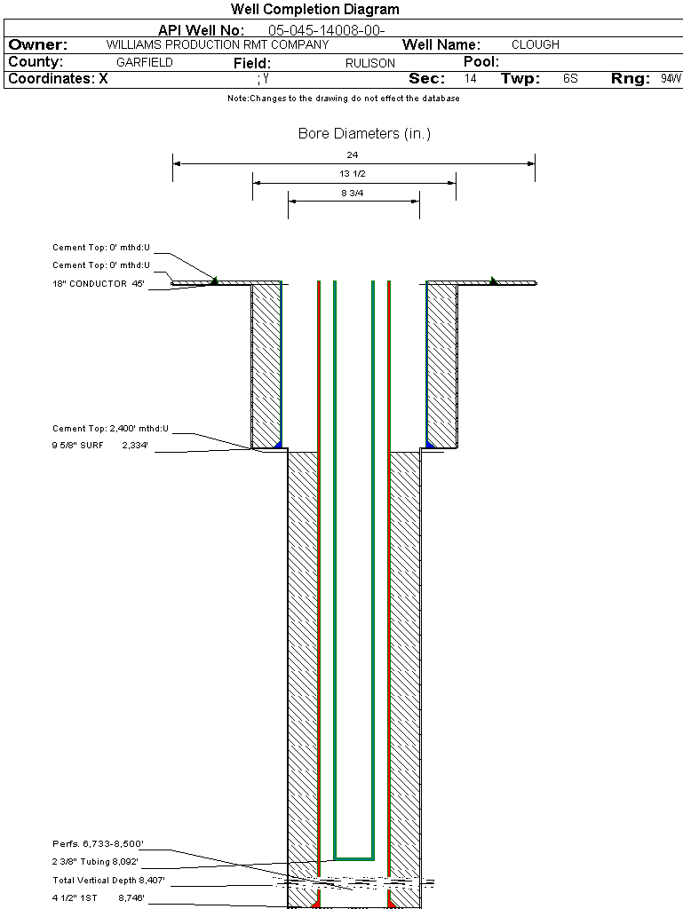 Wellbore #00 Wellbore Classification: GW Status: PR - 3/5/2007 Measured TD: 8770 ft. Vertical TD: 8407 ft.| Wellbore Data for Original Wellbore | Wellbore Classification: GW PR - 3/5/2007 | | Wellbore Permit | DIRECTIONAL | | Permit #: | 20071247 | Expiration Date: | 4/10/2008 | | Proposed Top PZ Location: | Sec: Twp: | Footage: 289 FNL 1968 FEL | | Bottom Hole Location: | Sec:14 Twp: 6S 94W | Footage: 289 FNL 1968 FEL | | Proposed Depth/Form: | 8667 ft. | | Surface Mineral Owner Same: | No | | Mineral Owner: | FEE | Surface Owner: | FEE | | Unit: | | Unit Number: | | | Formation And Spacing: | Code: WMFK , Formation: WILLIAMS FORK , Order: 139-38 , Unit Acreage: 320, Drill Unit: E2 |