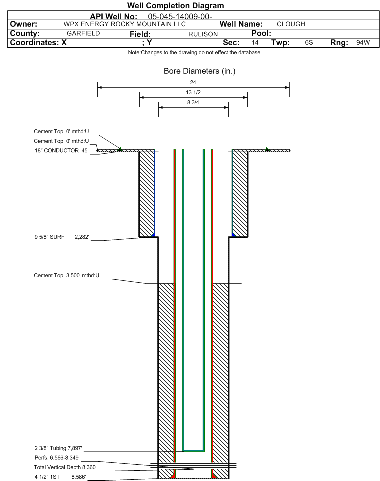 Wellbore #00 Wellbore Classification: GW Status: PR - 1/23/2008 Measured TD: 8606 ft. Vertical TD: 8360 ft.| Wellbore Data for Original Wellbore | Wellbore Classification: GW PR - 1/23/2008 | | Wellbore Permit | DIRECTIONAL | | Permit #: | 10080521 | Expiration Date: | 3/23/2009 | | Proposed Top PZ Location: | Sec: Twp: | Footage: 927 FNL 1974 FEL | | Bottom Hole Location: | Sec:14 Twp: 6S 94W | Footage: 927 FNL 1974 FEL | | Proposed Depth/Form: | 8508 ft. | | Surface Mineral Owner Same: | No | | Mineral Owner: | FEE | Surface Owner: | FEE | | Unit: | | Unit Number: | | | Formation And Spacing: | Code: WMFK , Formation: WILLIAMS FORK , Order: 139-38 , Unit Acreage: 320, Drill Unit: E/2 |