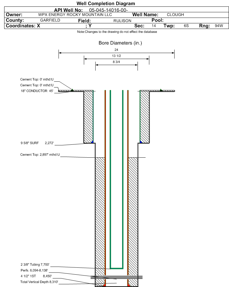 | Wellbore Completed | | Completion Date: | 5/31/2008 | | Spud Date: | 5/17/2008 | Spud Date Is: | ACTUAL | | Measured TD: | 8470 ft. | Measured PB depth: | 8304 ft. | | True Vertical TD: | 8310 ft. | True Vertical PB depth: | | | Top PZ Location: | Sec:14 Twp: 6S 94W | Footage: 1967 FNL 1978 FEL | | Bottom Hole Location: | Sec:14 Twp: 6S 94W | Footage: 1967 FNL 1978 FEL | | Log Types: | CBL; RMTE; MUD | | Casing: | String Type: CONDUCTOR, Hole Size: 24 in., Size: 18 in., Top: 0 ft., Depth: 45 ft., Weight: 48 , Citings Type: ACTUAL | | Cement: | Sacks: 25, Top: 0 ft., Bottom: 45 ft., Determination Method: CALC | | Casing: | String Type: SURF, Hole Size: 13.5 in., Size: 9.625 in., Top: 0 ft., Depth: 2272 ft., Weight: 32.3 , Citings Type: ACTUAL | | Cement: | Sacks: 460, Top: 0 ft., Bottom: 2272 ft., Determination Method: CALC | | Casing: | String Type: 1ST, Hole Size: 8.75 in., Size: 4.5 in., Top: 0 ft., Depth: 8450 ft., Weight: 11.6 , Citings Type: ACTUAL | | Cement: | Sacks: 1300, Top: 2897 ft., Bottom: 8450 ft., Determination Method: CBL | | Formation | Interval Top | Log Bottom | Cored | DSTs | | WASATCH G | 1975 ft. | | N | N | | MESAVERDE | 4564 ft. | | N | N | | CAMEO | 7468 ft. | | N | N | | ROLLINS | 8408 ft. | | N | N |