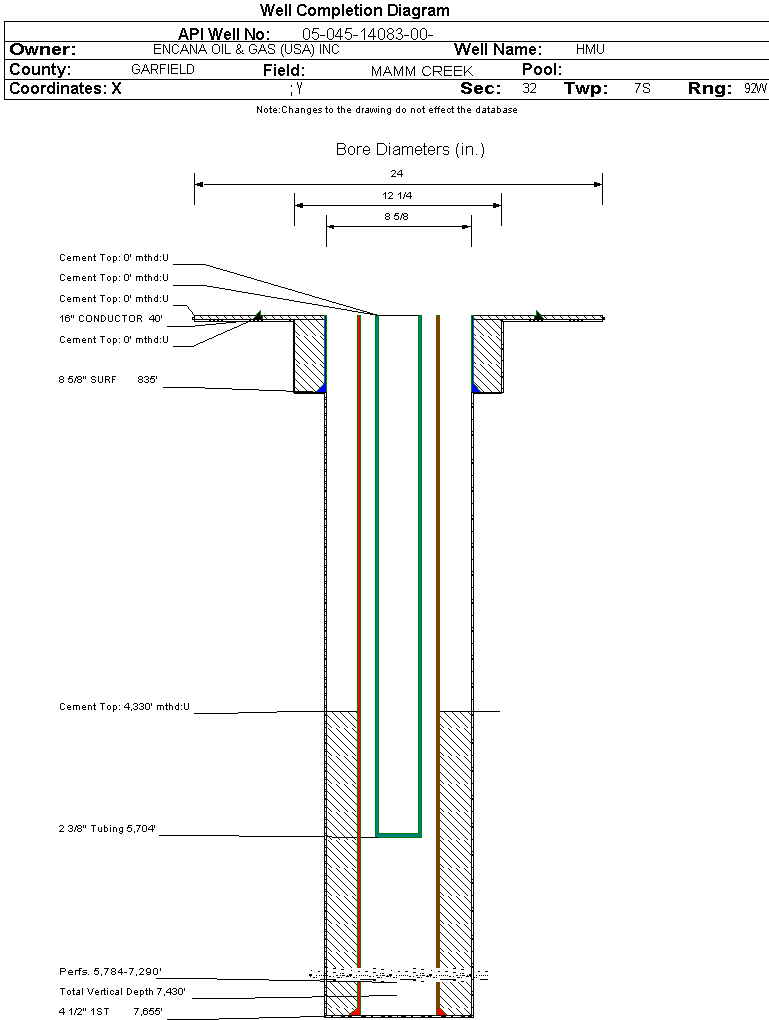 | Wellbore Completed | | Completion Date: | 7/20/2007 | | Spud Date: | 7/4/2007 | Spud Date Is: | ACTUAL | | Measured TD: | 7685 ft. | Measured PB depth: | 7594 ft. | | True Vertical TD: | 7430 ft. | True Vertical PB depth: | | | Top PZ Location: | Sec:32 Twp: 7S 92W | Footage: 673 FNL 1857 FWL | | Bottom Hole Location: | Sec:32 Twp: 7S 92W | Footage: 673 FNL 1857 FWL | | Log Types: | RST-BONA LOG, RST/GR, CBL/GR/TEMP | | Casing: | String Type: CONDUCTOR, Hole Size: 24 in., Size: 16 in., Top: 0 ft., Depth: 40 ft., Weight: , Citings Type: ACTUAL | | Cement: | Sacks: 4, Top: 0 ft., Bottom: 40 ft., Determination Method: CALC | | Casing: | String Type: SURF, Hole Size: 12.25 in., Size: 8.625 in., Top: 0 ft., Depth: 835 ft., Weight: , Citings Type: ACTUAL | | Cement: | Sacks: 440, Top: 0 ft., Bottom: 840 ft., Determination Method: CALC | | Casing: | String Type: 1ST, Hole Size: 8.625 in., Size: 4.5 in., Top: 0 ft., Depth: 7655 ft., Weight: , Citings Type: ACTUAL | | Cement: | Sacks: 993, Top: 4330 ft., Bottom: 7655 ft., Determination Method: CBL | | Casing: | String Type: 2ND, Hole Size: , Size: , Top: 0 ft., Depth: , Weight: , Citings Type: ACTUAL | | Cement: | Sacks: , Top: , Bottom: , Determination Method: | | Casing: | String Type: 3RD, Hole Size: , Size: , Top: 0 ft., Depth: , Weight: , Citings Type: ACTUAL | | Cement: | Sacks: , Top: , Bottom: , Determination Method: | | Casing: | String Type: 1ST LINER, Hole Size: , Size: , Top: 0 ft., Depth: , Weight: , Citings Type: ACTUAL | | Cement: | Sacks: , Top: , Bottom: , Determination Method: | | Formation | Interval Top | Log Bottom | Cored | DSTs | | WASATCH | 0 ft. | 4677 ft. | N | N | | WILLIAMS FORK | 4678 ft. | 7561 ft. | N | N | | ROLLINS | 7562 ft. | 7685 ft. | N | N |