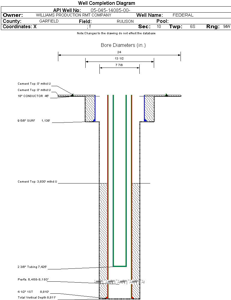 | Wellbore Completed | | Completion Date: | 8/26/2007 | | Spud Date: | 8/4/2007 | Spud Date Is: | ACTUAL | | Measured TD: | 8824 ft. | Measured PB depth: | 8370 ft. | | True Vertical TD: | 8811 ft. | True Vertical PB depth: | | | Top PZ Location: | Sec:10 Twp: 6S 94W | Footage: 1897 FSL 1924 FWL | | Bottom Hole Location: | Sec:10 Twp: 6S 94W | Footage: 1897 FSL 1924 FWL | | Log Types: | CBL;RESERVOIR MONITOR TOOL ELITE, TRIP COMBO | | Casing: | String Type: CONDUCTOR, Hole Size: 24 in., Size: 18 in., Top: , Depth: 45 ft., Weight: 48 , Citings Type: ACTUAL | | Cement: | Sacks: 25, Top: 0 ft., Bottom: 45 ft., Determination Method: | | Casing: | String Type: SURF, Hole Size: 13.5 in., Size: 9.625 in., Top: 0 ft., Depth: 1138 ft., Weight: , Citings Type: ACTUAL | | Cement: | Sacks: 290, Top: 0 ft., Bottom: 1138 ft., Determination Method: | | Casing: | String Type: 1ST, Hole Size: 7.875 in., Size: 4.5 in., Top: 0 ft., Depth: 8810 ft., Weight: , Citings Type: ACTUAL | | Cement: | Sacks: 1308, Top: 3830 ft., Bottom: 8810 ft., Determination Method: CBL | | Formation | Interval Top | Log Bottom | Cored | DSTs | | WASATCH G | 2436 ft. | | N | N | | WILLIAMS FORK | 4990 ft. | | N | N | | CAMEO | 7751 ft. | | N | N | | ROLLINS | 8752 ft. | | N | N |