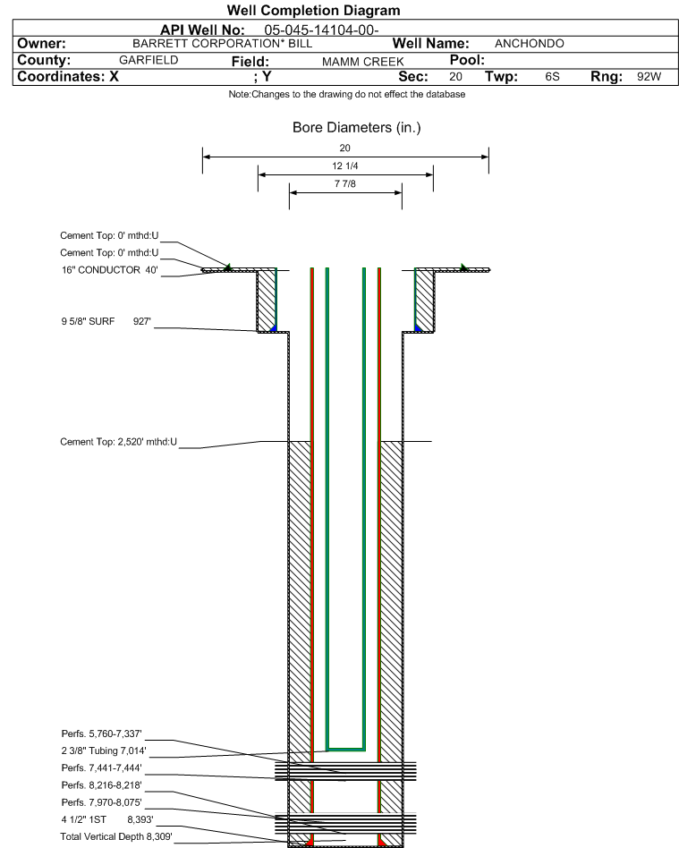 | Wellbore Completed | | Completion Date: | 7/11/2007 | | Spud Date: | 6/30/2007 | Spud Date Is: | ACTUAL | | Measured TD: | 8424 ft. | Measured PB depth: | 8350 ft. | | True Vertical TD: | 8309 ft. | True Vertical PB depth: | 8235 ft. | | Top PZ Location: | Sec:20 Twp: 6S 92W | Footage: 2437 FNL 1973 FEL | | Bottom Hole Location: | Sec:20 Twp: 6S 92W | Footage: 2437 FNL 1973 FEL | | Log Types: | HALLIBURTON HRI/DSN/SD; SCHLUMBERGER CBL/GR/COLLARS | | Casing: | String Type: CONDUCTOR, Hole Size: 20 in., Size: 16 in., Top: , Depth: 40 ft., Weight: , Citings Type: ACTUAL | | Cement: | Sacks: , Top: , Bottom: 40 ft., Determination Method: | | Casing: | String Type: SURF, Hole Size: 12.25 in., Size: 9.625 in., Top: 0 ft., Depth: 927 ft., Weight: , Citings Type: ACTUAL | | Cement: | Sacks: 260, Top: 0 ft., Bottom: 927 ft., Determination Method: | | Casing: | String Type: 1ST, Hole Size: 7.875 in., Size: 4.5 in., Top: 0 ft., Depth: 8393 ft., Weight: , Citings Type: ACTUAL | | Cement: | Sacks: 900, Top: 2520 ft., Bottom: 8393 ft., Determination Method: CBL | | Formation | Interval Top | Log Bottom | Cored | DSTs | | WILLIAMS FORK | 3540 ft. | | N | N | | ROLLINS | 7202 ft. | | N | N | | COZZETTE | 7800 ft. | | N | N | | CORCORAN | 8347 ft. | | N | N |