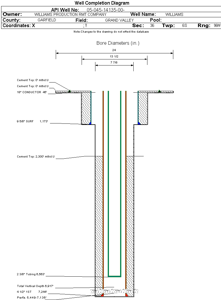| Wellbore Completed | | Completion Date: | 7/28/2007 | | Spud Date: | 7/16/2007 | Spud Date Is: | ACTUAL | | Measured TD: | 7271 ft. | Measured PB depth: | 7219 ft. | | True Vertical TD: | 6917 ft. | True Vertical PB depth: | | | Top PZ Location: | Sec:36 Twp: 6S 96W | Footage: 1779 FSL 898 FEL | | Bottom Hole Location: | Sec:36 Twp: 6S 96W | Footage: 1779 FSL 898 FEL | | Log Types: | CBL; HIGH RESOLUTIN INDUCTION,SPECTRAL DENSITY,DUAL SPACED NEUTRON, MUD | | Casing: | String Type: CONDUCTOR, Hole Size: 24 in., Size: 18 in., Top: , Depth: 45 ft., Weight: 48 , Citings Type: ACTUAL | | Cement: | Sacks: 25, Top: 0 ft., Bottom: 45 ft., Determination Method: | | Casing: | String Type: SURF, Hole Size: 13.5 in., Size: 9.625 in., Top: 0 ft., Depth: 1173 ft., Weight: , Citings Type: ACTUAL | | Cement: | Sacks: 325, Top: 0 ft., Bottom: 1173 ft., Determination Method: | | Casing: | String Type: 1ST, Hole Size: 7.875 in., Size: 4.5 in., Top: 0 ft., Depth: 7244 ft., Weight: , Citings Type: ACTUAL | | Cement: | Sacks: 861, Top: 2300 ft., Bottom: 7244 ft., Determination Method: CBL | | Formation | Interval Top | Log Bottom | Cored | DSTs | | WASATCH G | 1901 ft. | | N | N | | WILLIAMS FORK | 4062 ft. | | N | N | | CAMEO | 6645 ft. | | N | N | | ROLLINS | 7200 ft. | | N | N |