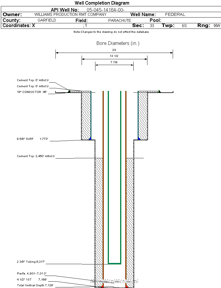 | Wellbore Completed | | Completion Date: | 9/13/2007 | | Spud Date: | 7/12/2007 | Spud Date Is: | ACTUAL | | Measured TD: | 7186 ft. | Measured PB depth: | 7140 ft. | | True Vertical TD: | 7128 ft. | True Vertical PB depth: | | | Top PZ Location: | Sec:33 Twp: 6S 95W | Footage: 213 FNL 1107 FWL | | Bottom Hole Location: | Sec:33 Twp: 6S 95W | Footage: 213 FNL 1107 FWL | | Log Types: | CBL; SPECTRAL DENSITY, DUAL SPACED NEUTRON, ARRAY COMP TRUE RESISTIVITY; MUD | | Casing: | String Type: CONDUCTOR, Hole Size: 24 in., Size: 18 in., Top: 48 ft., Depth: 45 ft., Weight: , Citings Type: ACTUAL | | Cement: | Sacks: 25, Top: 0 ft., Bottom: 45 ft., Determination Method: | | Casing: | String Type: SURF, Hole Size: 13.5 in., Size: 9.625 in., Top: 0 ft., Depth: 1773 ft., Weight: , Citings Type: ACTUAL | | Cement: | Sacks: 473, Top: 0 ft., Bottom: 1773 ft., Determination Method: | | Casing: | String Type: 1ST, Hole Size: 7.875 in., Size: 4.5 in., Top: 0 ft., Depth: 7169 ft., Weight: , Citings Type: ACTUAL | | Cement: | Sacks: 1025, Top: 2450 ft., Bottom: 7169 ft., Determination Method: CBL | | Formation | Interval Top | Log Bottom | Cored | DSTs | | WASATCH G | 1553 ft. | | N | N | | MESAVERDE | 3764 ft. | | N | N | | CAMEO | 6453 ft. | | N | N | | ROLLINS | 7099 ft. | | N | N |