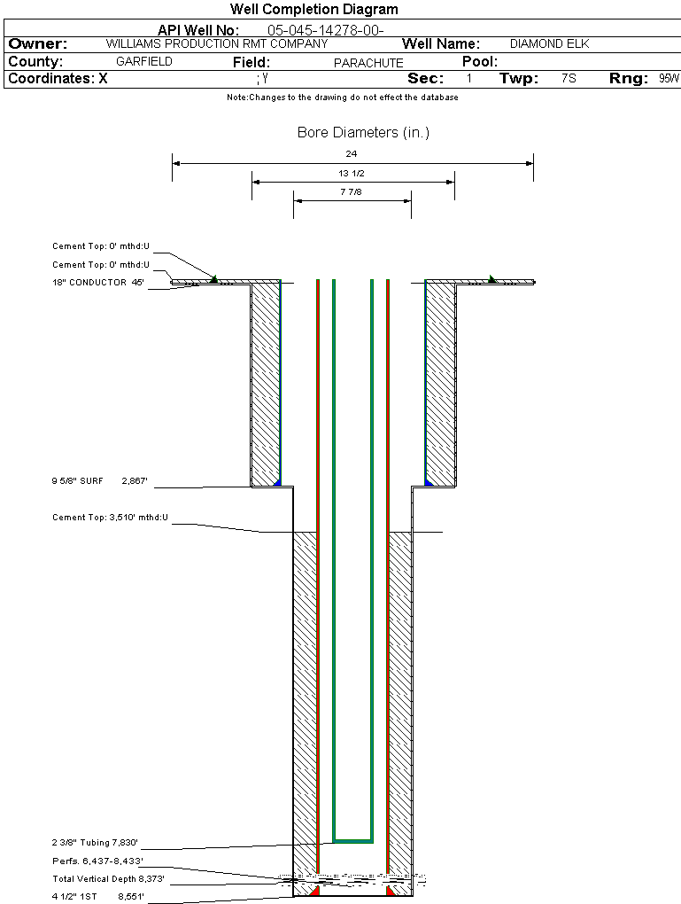 | Wellbore Completed | | Completion Date: | 3/21/2008 | | Spud Date: | 3/9/2008 | Spud Date Is: | ACTUAL | | Measured TD: | 8570 ft. | Measured PB depth: | 8520 ft. | | True Vertical TD: | 8373 ft. | True Vertical PB depth: | 8323 ft. | | Top PZ Location: | Sec:1 Twp: 7S 95W | Footage: 107 FNL 704 FEL | | Bottom Hole Location: | Sec:1 Twp: 7S 95W | Footage: 107 FNL 704 FEL | | Log Types: | CBL; RMTE; MUD | | Casing: | String Type: CONDUCTOR, Hole Size: 24 in., Size: 18 in., Top: 0 ft., Depth: 45 ft., Weight: , Citings Type: ACTUAL | | Cement: | Sacks: 25, Top: 0 ft., Bottom: 45 ft., Determination Method: | | Casing: | String Type: SURF, Hole Size: 13.5 in., Size: 9.625 in., Top: 0 ft., Depth: 2867 ft., Weight: , Citings Type: ACTUAL | | Cement: | Sacks: 628, Top: 0 ft., Bottom: 2867 ft., Determination Method: | | Casing: | String Type: 1ST, Hole Size: 7.875 in., Size: 4.5 in., Top: 0 ft., Depth: 8551 ft., Weight: , Citings Type: ACTUAL | | Cement: | Sacks: 993, Top: 3510 ft., Bottom: 8551 ft., Determination Method: CBL | | Formation | Interval Top | Log Bottom | Cored | DSTs | | WASATCH G | 2542 ft. | | N | N | | MESAVERDE | 5023 ft. | | N | N | | CAMEO | 7573 ft. | | N | N | | ROLLINS | 8518 ft. | | N | N |