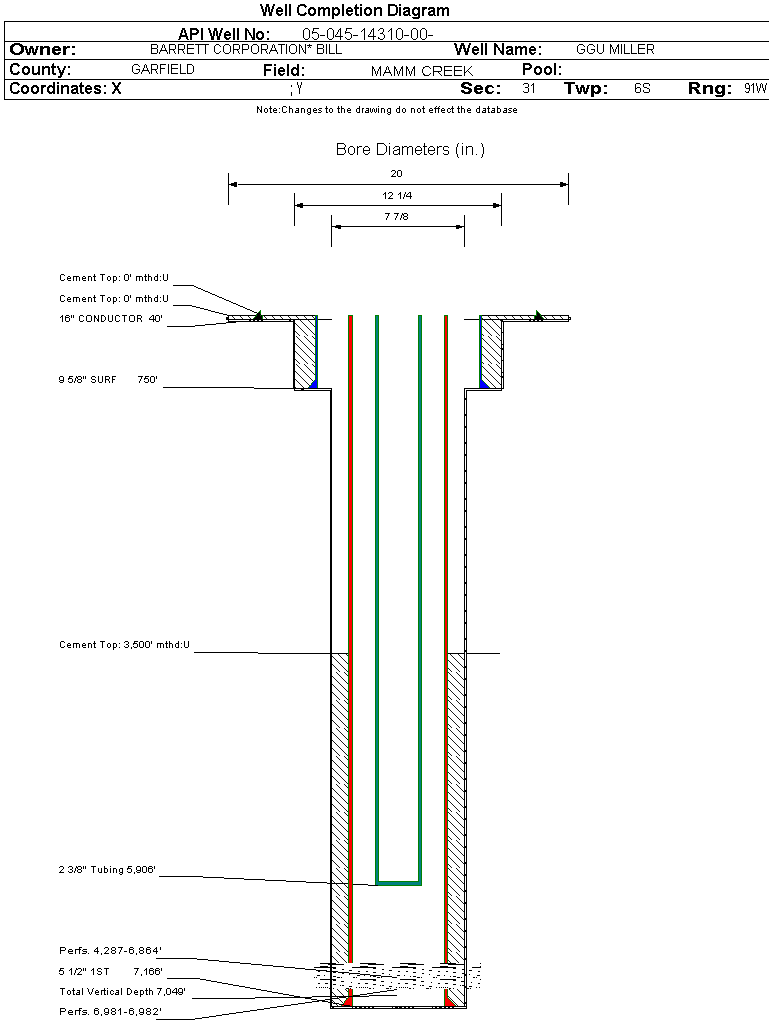 | Wellbore Completed | | Completion Date: | 10/28/2007 | | Spud Date: | 10/16/2007 | Spud Date Is: | ACTUAL | | Measured TD: | 7176 ft. | Measured PB depth: | 7120 ft. | | True Vertical TD: | 7049 ft. | True Vertical PB depth: | 6993 ft. | | Top PZ Location: | Sec:31 Twp: 6S 91W | Footage: 2631 FNL 682 FWL | | Bottom Hole Location: | Sec:31 Twp: 6S 91W | Footage: 2631 FNL 682 FWL | | Log Types: | HALLIBURTON HRI/SD/DSN/;SCHLUMBERGER CBL/GR/CCL, MUD, TEMP | | Casing: | String Type: CONDUCTOR, Hole Size: 20 in., Size: 16 in., Top: , Depth: 40 ft., Weight: , Citings Type: ACTUAL | | Cement: | Sacks: , Top: 0 ft., Bottom: 40 ft., Determination Method: | | Casing: | String Type: SURF, Hole Size: 12.25 in., Size: 9.625 in., Top: 0 ft., Depth: 750 ft., Weight: , Citings Type: ACTUAL | | Cement: | Sacks: 230, Top: 0 ft., Bottom: 750 ft., Determination Method: | | Casing: | String Type: 1ST, Hole Size: 7.875 in., Size: 5.5 in., Top: 0 ft., Depth: 7166 ft., Weight: , Citings Type: ACTUAL | | Cement: | Sacks: 900, Top: 3500 ft., Bottom: 7166 ft., Determination Method: CBL | | Formation | Interval Top | Log Bottom | Cored | DSTs | | WILLIAMS FORK | 3336 ft. | | N | N | | ROLLINS | 6903 ft. | | N | N |