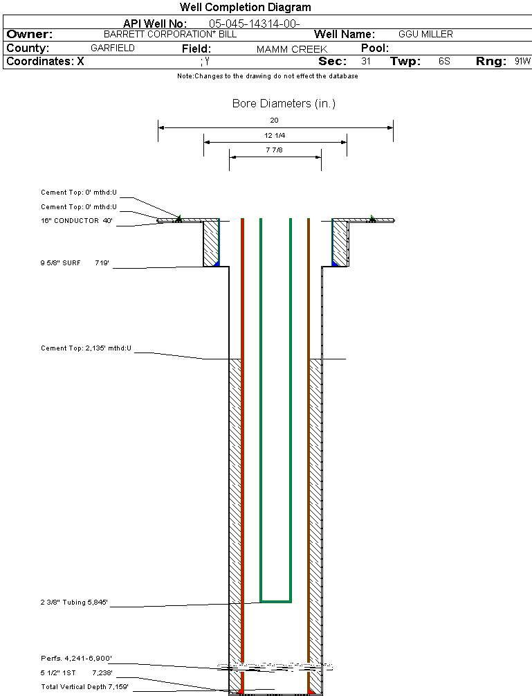 Wellbore #00 Wellbore Classification: GW Status: PR - 3/15/2008 Measured TD: 7271 ft. Vertical TD: 7159 ft.| Wellbore Data for Original Wellbore | Wellbore Classification: GW PR - 3/15/2008 | | Wellbore Permit | DIRECTIONAL | | Permit #: | 20073602 | Expiration Date: | 6/26/2008 | | Proposed Top PZ Location: | Sec: Twp: | Footage: 2240 FNL 660 FWL | | Bottom Hole Location: | Sec:31 Twp: 6S 91W | Footage: 2240 FNL 660 FWL | | Proposed Depth/Form: | 7216 ft. | | Surface Mineral Owner Same: | Yes | | Mineral Owner: | FEE | Surface Owner: | FEE | | Unit: | GIBSON GULCH UN | Unit Number: | COC052447X | | Formation And Spacing: | Code: ILES , Formation: ILES , Order: , Unit Acreage: , Drill Unit: | | Formation And Spacing: | Code: WMFK , Formation: WILLIAMS FORK , Order: , Unit Acreage: , Drill Unit: |