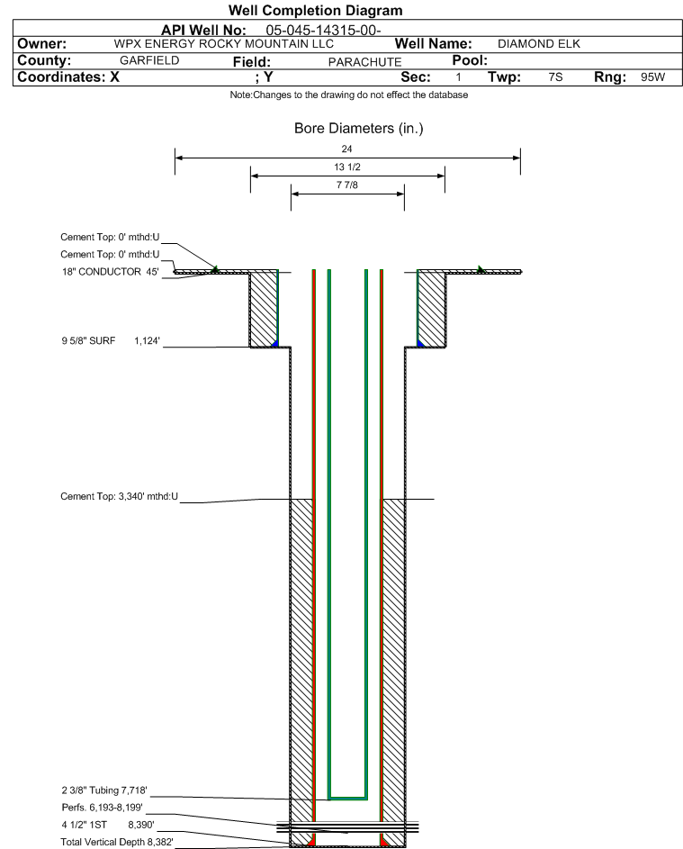 Wellbore #00 Wellbore Classification: GW Status: PR - 7/31/2008 Measured TD: 8410 ft. Vertical TD: 8382 ft.| Wellbore Data for Original Wellbore | Wellbore Classification: GW PR - 7/31/2008 | | Wellbore Permit | DIRECTIONAL | | Permit #: | 20072514 | Expiration Date: | 6/27/2008 | | Proposed Top PZ Location: | Sec: Twp: | Footage: 1096 FNL 936 FEL | | Bottom Hole Location: | Sec:1 Twp: 7S 95W | Footage: 1096 FNL 936 FEL | | Proposed Depth/Form: | 8461 ft. | | Surface Mineral Owner Same: | No | | Mineral Owner: | FEE | Surface Owner: | FEE | | Unit: | | Unit Number: | | | Formation And Spacing: | Code: WMFK , Formation: WILLIAMS FORK , Order: 440-35 , Unit Acreage: 320, Drill Unit: E2 |