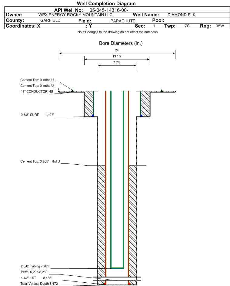 | Wellbore Completed | | Completion Date: | 3/31/2008 | | Spud Date: | 3/21/2008 | Spud Date Is: | ACTUAL | | Measured TD: | 8551 ft. | Measured PB depth: | 8430 ft. | | True Vertical TD: | 8472 ft. | True Vertical PB depth: | 8351 ft. | | Top PZ Location: | Sec:1 Twp: 7S 95W | Footage: 659 FNL 764 FEL | | Bottom Hole Location: | Sec:1 Twp: 7S 95W | Footage: 659 FNL 764 FEL | | Log Types: | CBL; RMTE; MUD | | Casing: | String Type: CONDUCTOR, Hole Size: 24 in., Size: 18 in., Top: 0 ft., Depth: 45 ft., Weight: , Citings Type: ACTUAL | | Cement: | Sacks: 25, Top: 0 ft., Bottom: 45 ft., Determination Method: | | Casing: | String Type: SURF, Hole Size: 13.5 in., Size: 9.625 in., Top: 0 ft., Depth: 1127 ft., Weight: , Citings Type: ACTUAL | | Cement: | Sacks: 628, Top: 0 ft., Bottom: 1127 ft., Determination Method: CALC | | Casing: | String Type: 1ST, Hole Size: 7.875 in., Size: 4.5 in., Top: 0 ft., Depth: 8466 ft., Weight: , Citings Type: ACTUAL | | Cement: | Sacks: 986, Top: 3265 ft., Bottom: 8466 ft., Determination Method: CBL | | Formation | Interval Top | Log Bottom | Cored | DSTs | | WASATCH G | 2522 ft. | | N | N | | MESAVERDE | 4908 ft. | | N | N | | CAMEO | 7417 ft. | | N | N | | ROLLINS | 8350 ft. | | N | N |