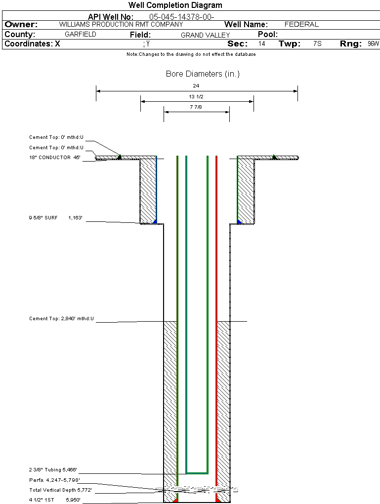 Wellbore #00 Wellbore Classification: GW Status: PR - 5/18/2007 Measured TD: 5960 ft. Vertical TD: 5772 ft.| Wellbore Data for Original Wellbore | Wellbore Classification: GW PR - 5/18/2007 | | Wellbore Permit | DIRECTIONAL | | Permit #: | 20072782 | Expiration Date: | 7/17/2008 | | Proposed Top PZ Location: | Sec: Twp: | Footage: 2527 FNL 1614 FEL | | Bottom Hole Location: | Sec:14 Twp: 7S 96W | Footage: 2527 FNL 1614 FEL | | Proposed Depth/Form: | 5981 ft. | | Surface Mineral Owner Same: | Yes | | Mineral Owner: | FEDERAL | Surface Owner: | FEDERAL | | Unit: | | Unit Number: | | | Formation And Spacing: | Code: WMFK , Formation: WILLIAMS FORK , Order: 510-9 , Unit Acreage: , Drill Unit: |