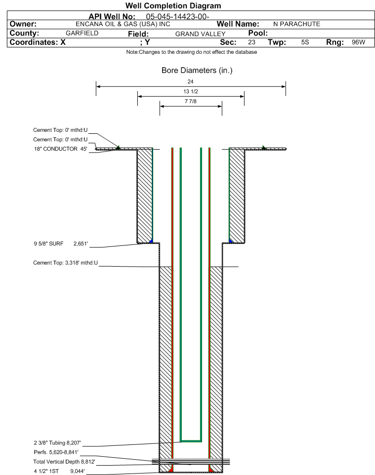 | Wellbore Completed | | Completion Date: | 1/21/2008 | | Spud Date: | 1/5/2008 | Spud Date Is: | ACTUAL | | Measured TD: | 9065 ft. | Measured PB depth: | 8997 ft. | | True Vertical TD: | 8812 ft. | True Vertical PB depth: | 8744 ft. | | Top PZ Location: | Sec:23 Twp: 5S 96W | Footage: 1492 FSL 1956 FWL | | Bottom Hole Location: | Sec:23 Twp: 5S 96W | Footage: 1492 FSL 1956 FWL | | Log Types: | CBL, RMTE | | Casing: | String Type: CONDUCTOR, Hole Size: 24 in., Size: 18 in., Top: 0 ft., Depth: 45 ft., Weight: , Citings Type: ACTUAL | | Cement: | Sacks: 25, Top: 0 ft., Bottom: 45 ft., Determination Method: | | Casing: | String Type: SURF, Hole Size: 13.5 in., Size: 9.625 in., Top: 0 ft., Depth: 2651 ft., Weight: , Citings Type: ACTUAL | | Cement: | Sacks: 578, Top: 0 ft., Bottom: 2651 ft., Determination Method: | | Casing: | String Type: 1ST, Hole Size: 7.875 in., Size: 4.5 in., Top: 0 ft., Depth: 9044 ft., Weight: , Citings Type: ACTUAL | | Cement: | Sacks: 925, Top: 3318 ft., Bottom: 9044 ft., Determination Method: CBL | | Formation | Interval Top | Log Bottom | Cored | DSTs | | FORT UNION | 3933 ft. | | N | N | | MESAVERDE | 5706 ft. | | N | N | | CAMEO | 8315 ft. | | N | N | | ROLLINS | 8981 ft. | | N | N |