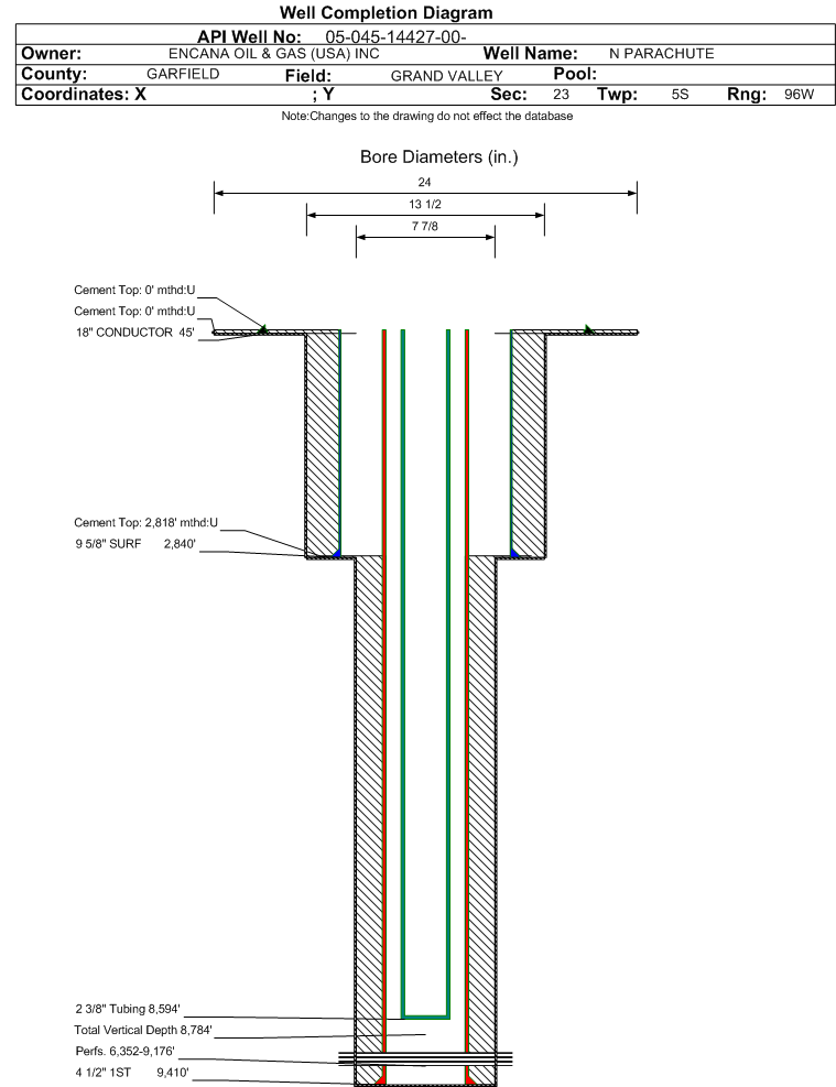 Wellbore #00 Wellbore Classification: GW Status: PR - 4/1/2025 Measured TD: 9420 ft. Vertical TD: 8784 ft.| Wellbore Data for Original Wellbore | Wellbore Classification: GW PR - 4/1/2025 | | Wellbore Permit | DIRECTIONAL | | Permit #: | 20073070 | Expiration Date: | 7/22/2008 | | Proposed Top PZ Location: | Sec: Twp: | Footage: 573 FSL 1841 FWL | | Bottom Hole Location: | Sec:23 Twp: 5S 96W | Footage: 573 FSL 1841 FWL | | Proposed Depth/Form: | 9494 ft. | | Surface Mineral Owner Same: | No | | Mineral Owner: | FEDERAL | Surface Owner: | FEE | | Unit: | | Unit Number: | | | Formation And Spacing: | Code: WMFK , Formation: WILLIAMS FORK , Order: 510-13 , Unit Acreage: , Drill Unit: |