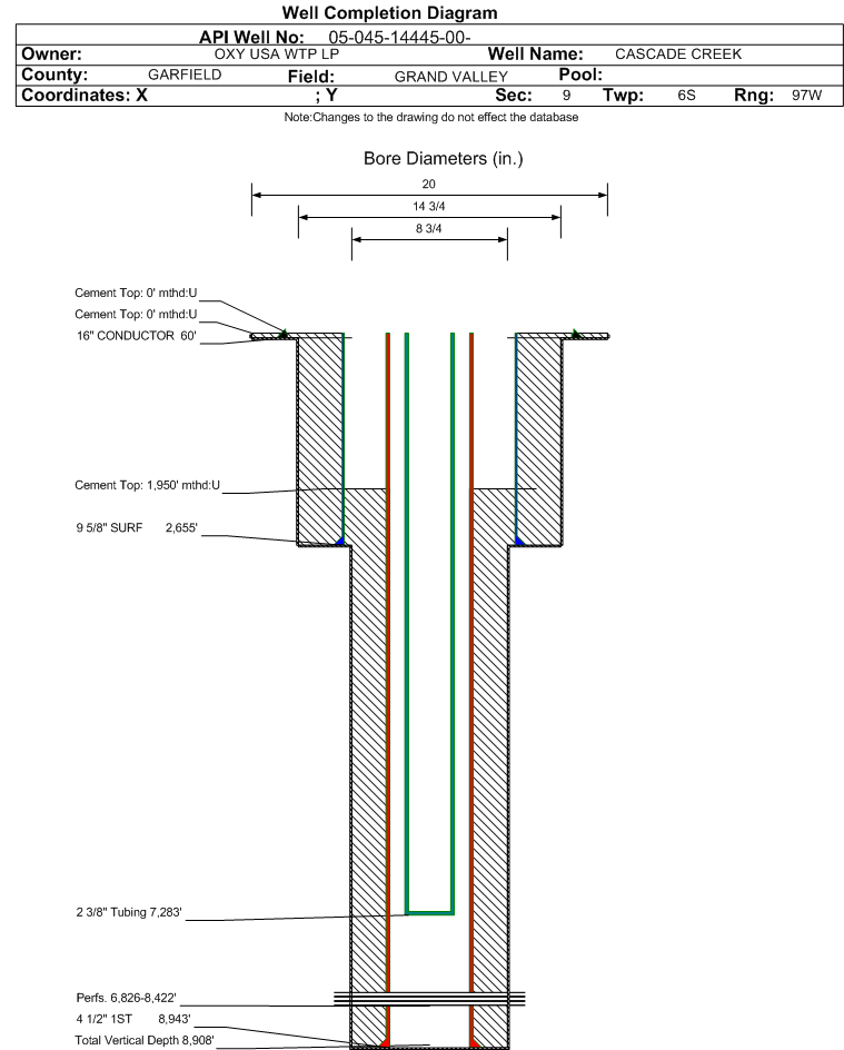 Wellbore #00 Wellbore Classification: GW Status: PR - 5/17/2012 Measured TD: 8958 ft. Vertical TD: 8908 ft.| Wellbore Data for Original Wellbore | Wellbore Classification: GW PR - 5/17/2012 | | Wellbore Permit | DIRECTIONAL | | Permit #: | 20074021 | Expiration Date: | 7/23/2008 | | Proposed Top PZ Location: | Sec:9 Twp: 6S 97W | Footage: 676 FSL 2388 FWL | | Bottom Hole Location: | Sec:9 Twp: 6S 97W | Footage: 676 FSL 2388 FWL | | Proposed Depth/Form: | 8836 ft. | | Surface Mineral Owner Same: | Yes | | Mineral Owner: | FEE | Surface Owner: | FEE | | Unit: | | Unit Number: | | | Formation And Spacing: | Code: WMFK , Formation: WILLIAMS FORK , Order: 510-15 , Unit Acreage: , Drill Unit: | | Casing: | String Type: 2ND, Hole Size: 6.25 in., Size: 4.5 in., Top: , Depth: 8836 ft., Weight: 11.6 , Citings Type: PLANNED | | Cement: | Sacks: 1135, Top: 5561 ft., Bottom: 8836 ft. |